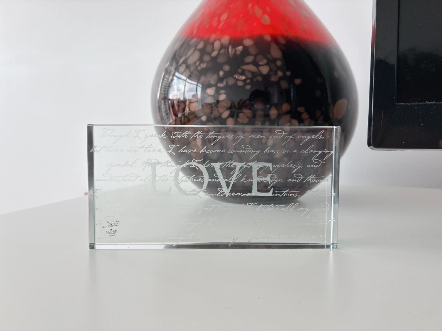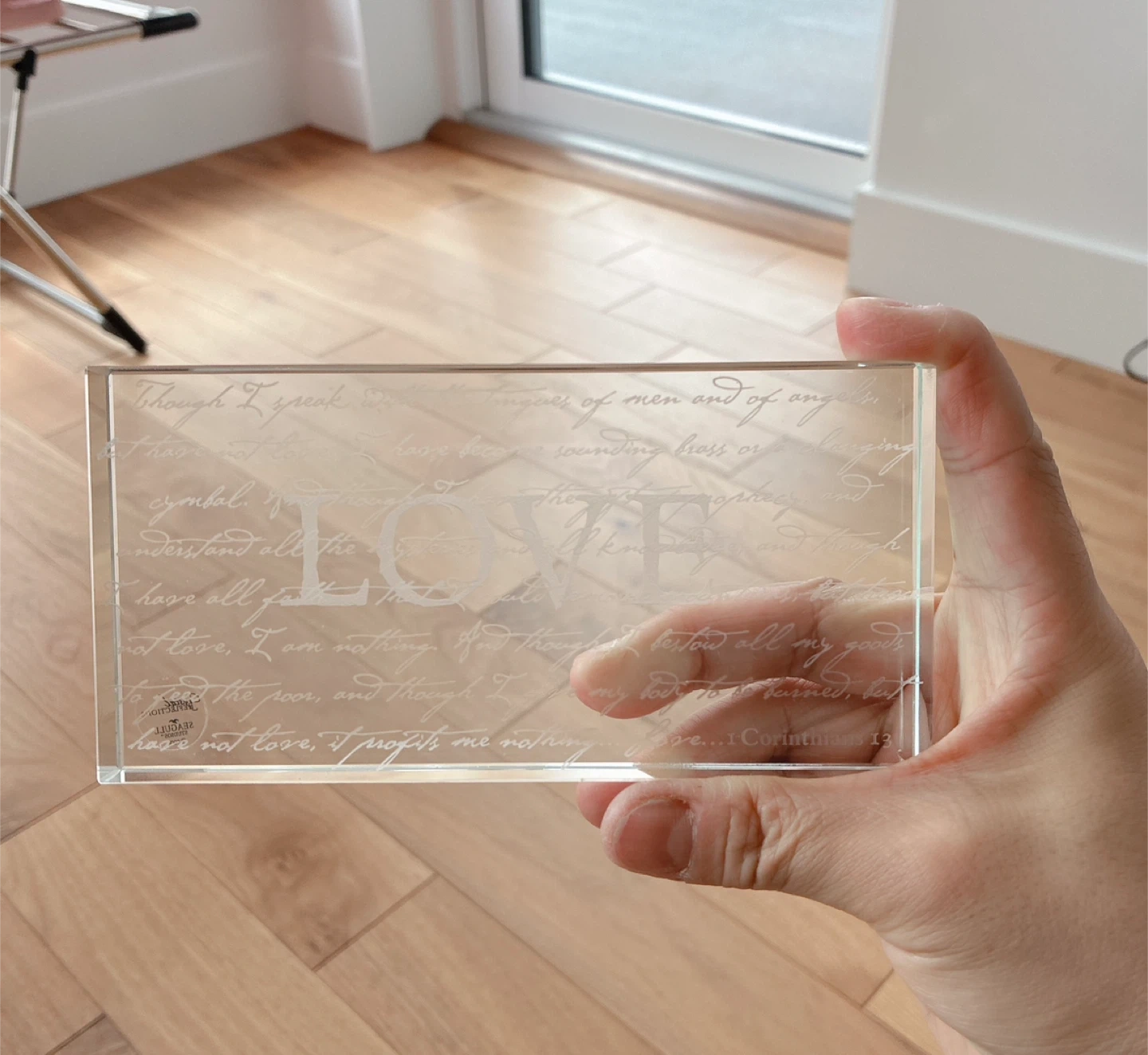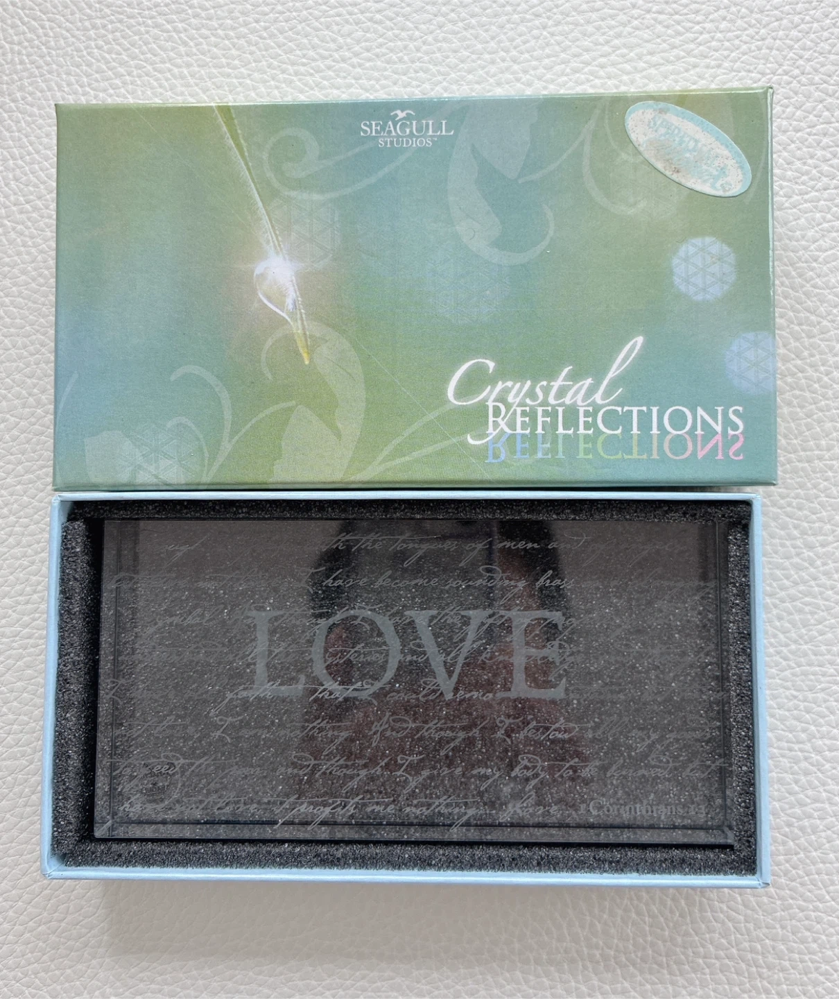 Crystal block with etched "Love" quote. "Though I speak with the tongues of men and of angels, but have not love, I have become sounding brass or a clanging cymbal. Of those that are the prophecy, and understand all the mysteries and all knowledge, and though I have all faith, so that I could remove mountains, but have not love, I am nothing. And though I bestow all my goods to feed the poor, and though I give my body to be burned, but have not love, it profiteth me nothing. ... 1 Corinthians 13". Includes original box.