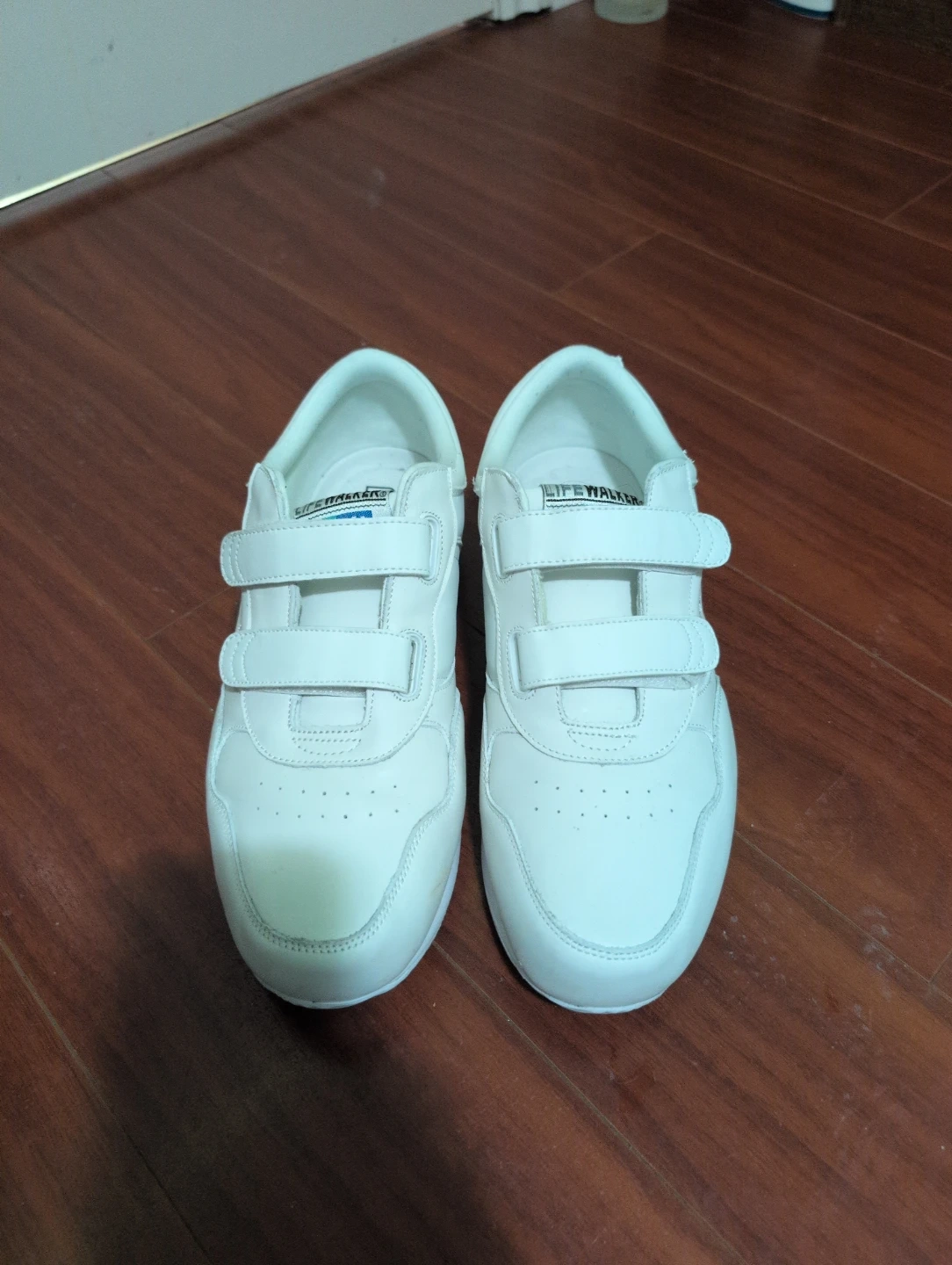 These Propet Life Walker shoes are white with a velcro closure. They are made of leather. These shoes are designed for comfort and support. Size 12. Box available