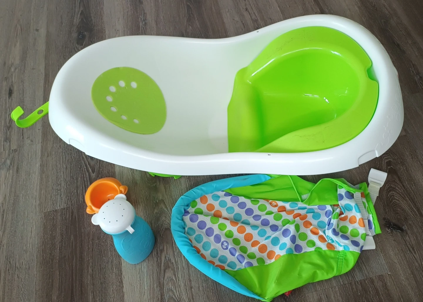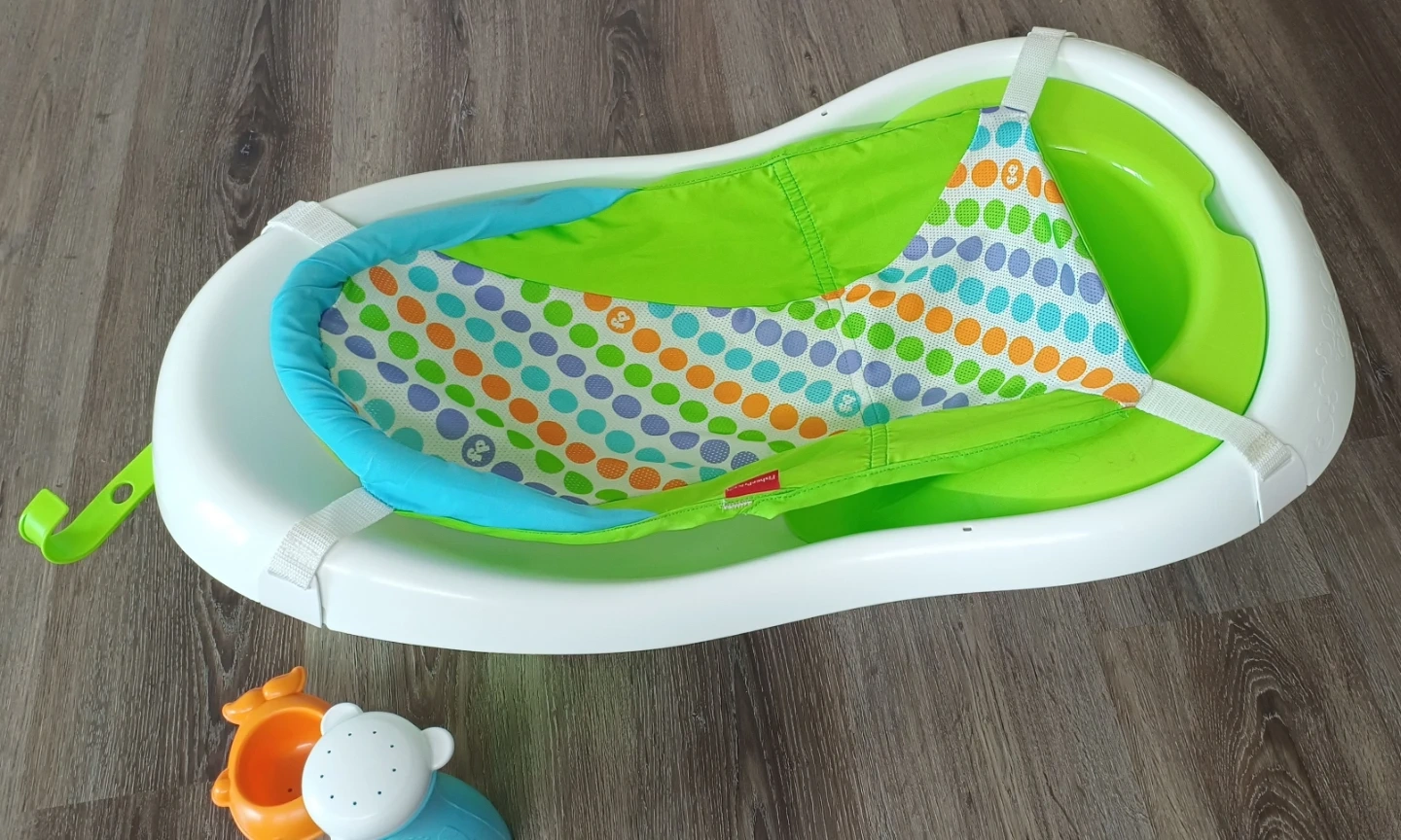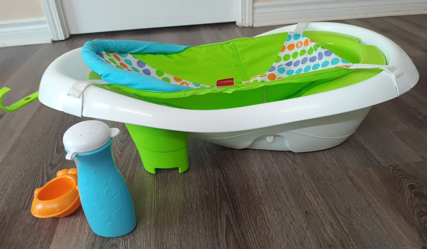 Fisher-Price baby tub with infant support sling and toy. It's designed to grow with your child, offering four stages: newborn sling, supported sit-up seat, sitter, and toddler tub. The tub comes with a whale toy and a whale-shaped scoop.