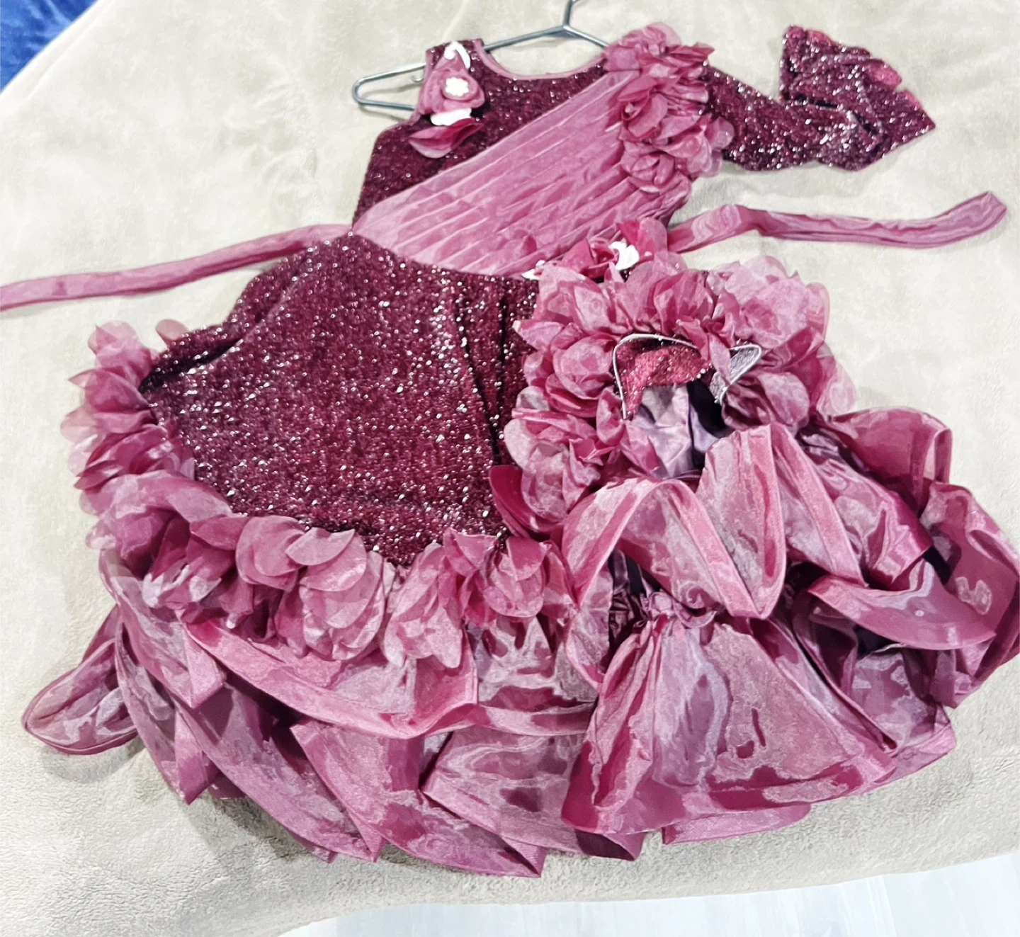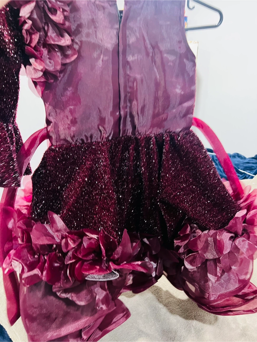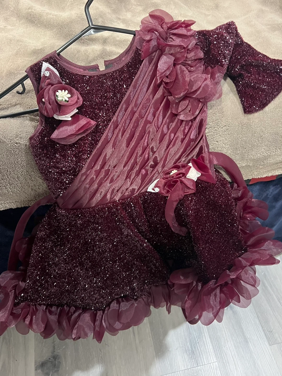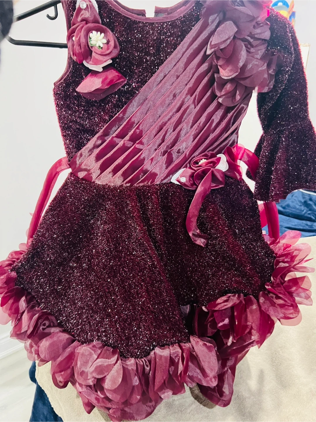 This sparkly performance dress is a vibrant burgundy colour with dazzling sequins on the bodice and sleeves. It features ruffled layers and floral accents for a stunning look. The dress is labelled size 26.