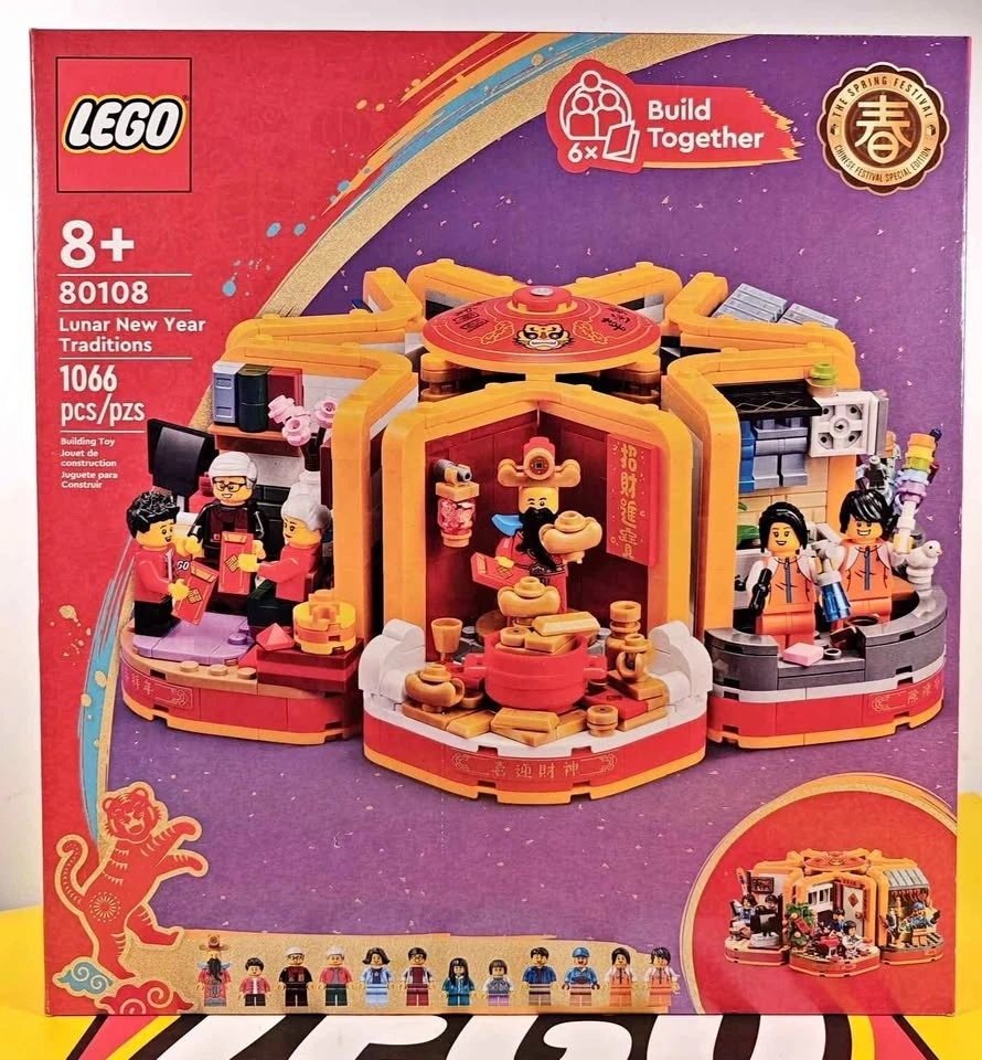 Celebrate the Lunar New Year with LEGO Chinese New Year 80108 Lunar New Year Traditions! This set captures the joy and customs of the festival, perfect for LEGO enthusiasts and cultural collectors. It includes 12 detailed minifigures and 6 modular displays depicting traditions like giving red envelopes and decorating with lanterns. Each scene comes with accessories for enhanced play. The modular builds can be arranged for a personalized display. This set is Brand New in Box and was retired in 2023, making it a rare collector's item. Let me know if you're interested!