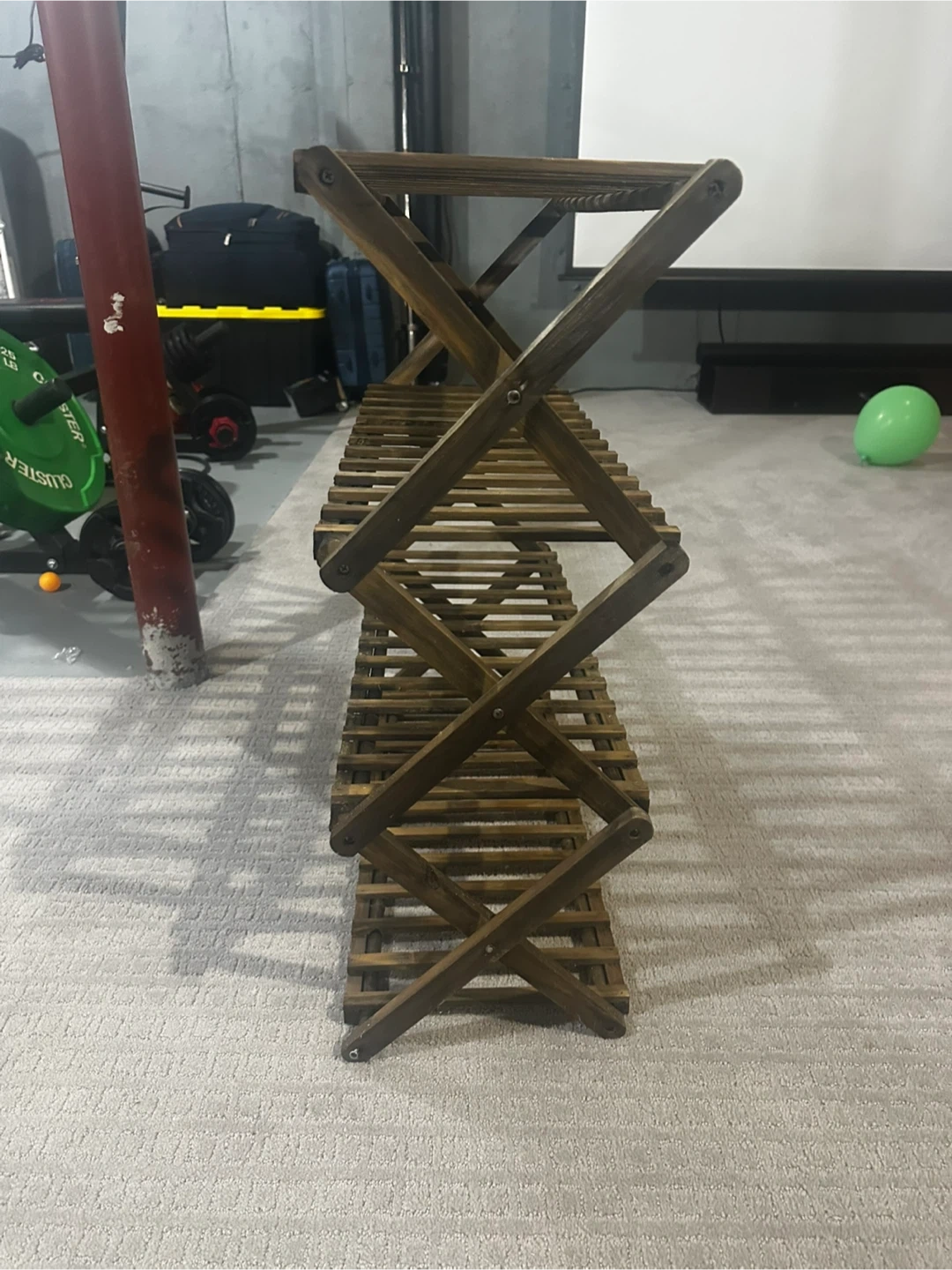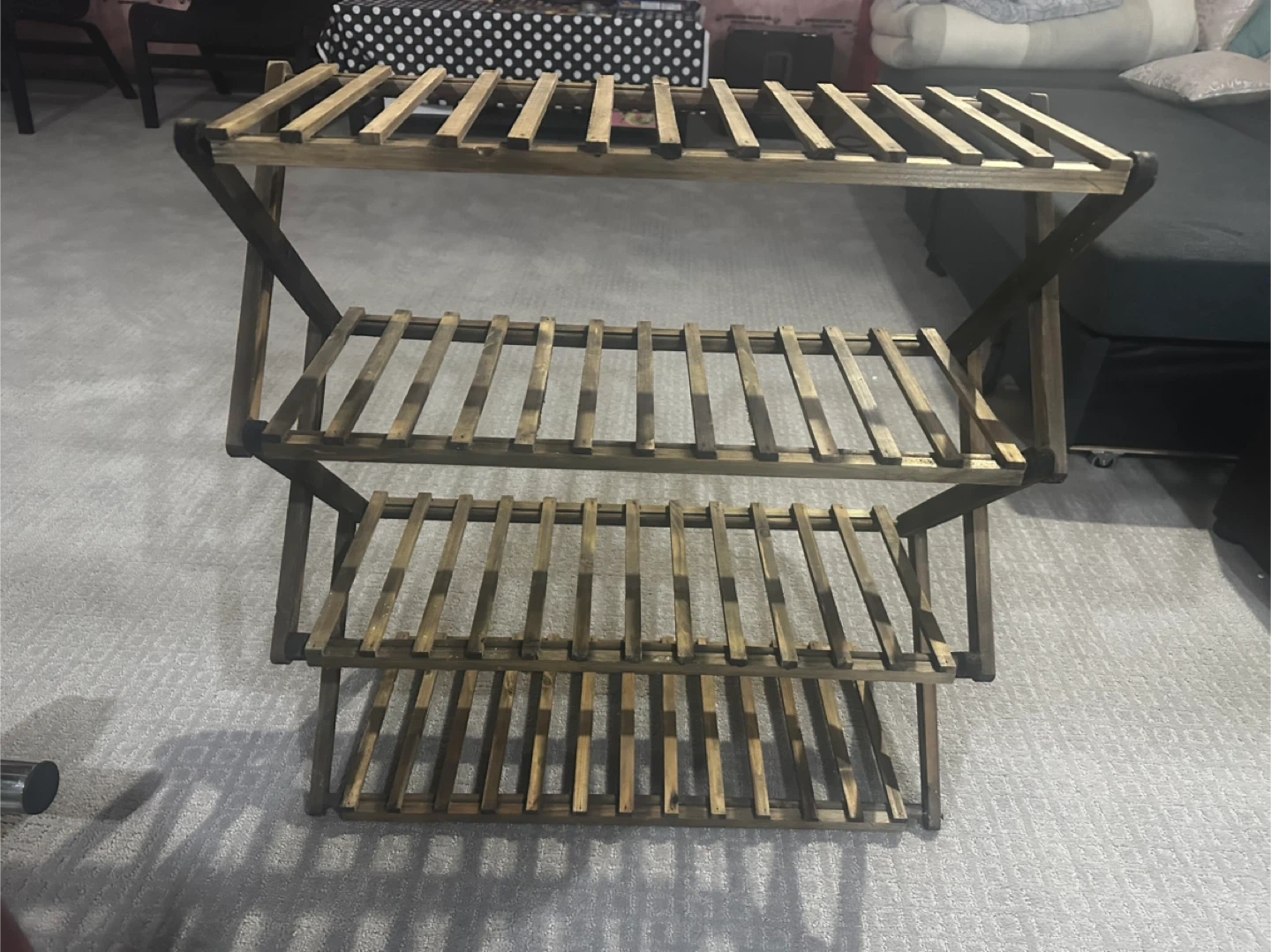 A wooden foldable shelf unit with three tiers. It's a collapsible design for easy storage. Made of wood.