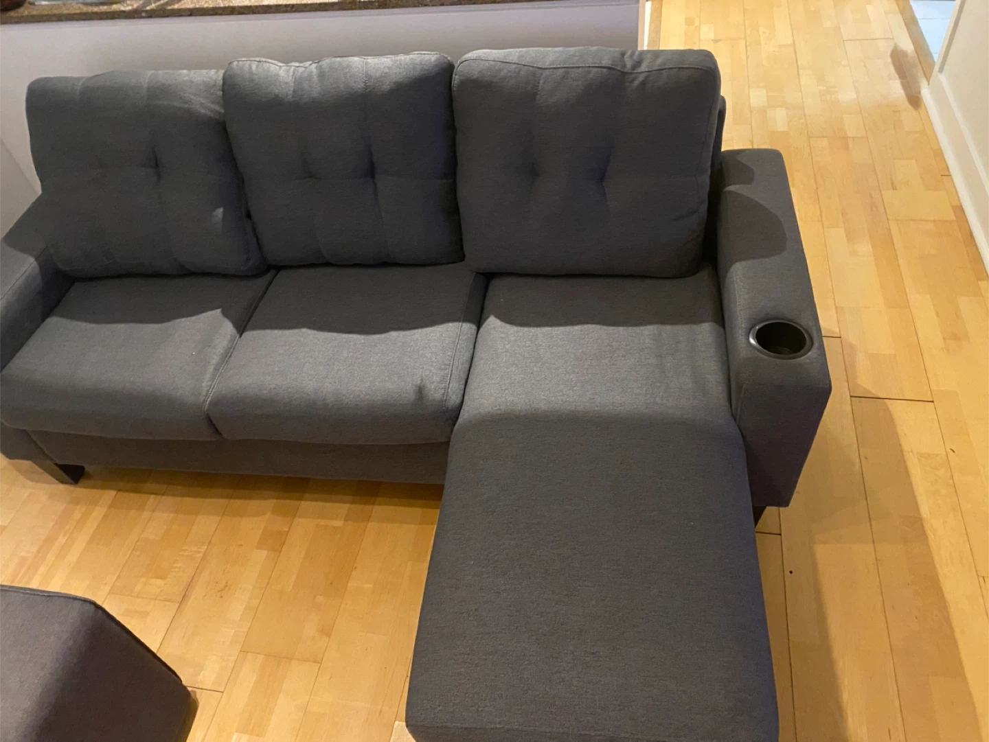 Selling a comfy grey sectional sofa! It features a chaise lounge and a convenient cup holder on the side. Perfect for relaxing and watching movies! Essentially brand new.