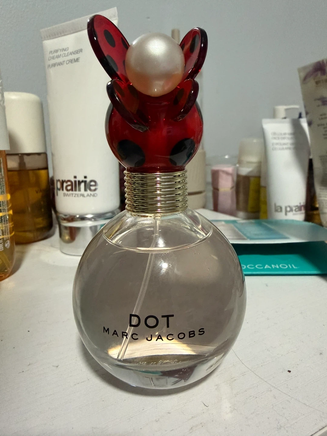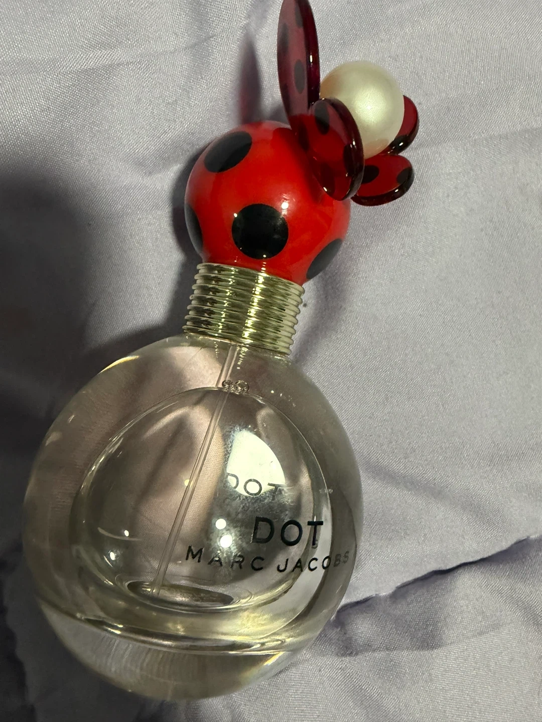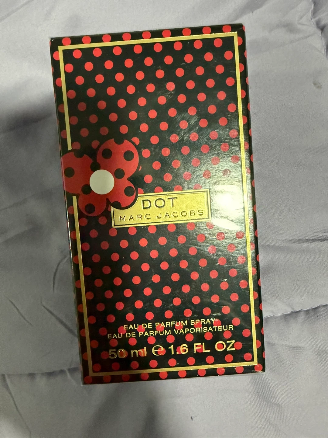 This is Marc Jacobs Dot Eau de Parfum Spray. It's a 50 ml (1.6 FL OZ) bottle with a distinctive ladybug-inspired cap. The packaging features a red and black polka dot design. A beautiful scent to wear.