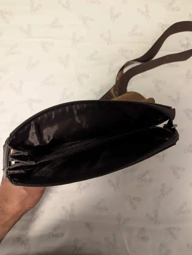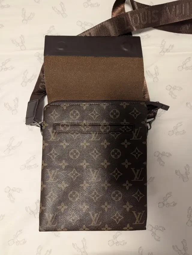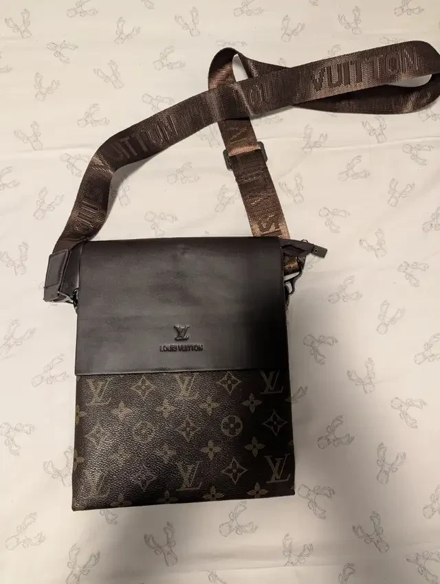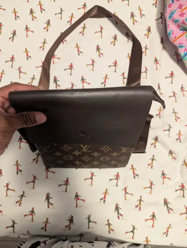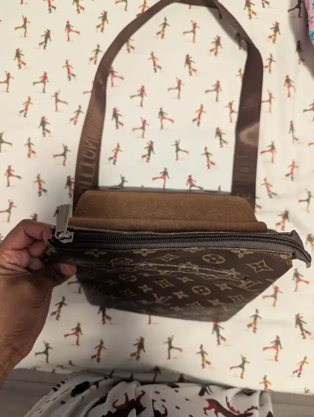 Brown Louis Vuitton crossbody bag with signature monogram print. Features a zip closure and an adjustable strap. Interior has multiple compartments for organization.