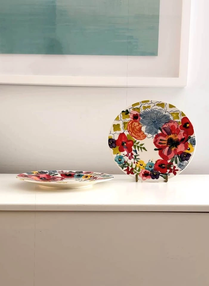 A rare and highly sought-after set of two Anthropologie "Sissinghurst Castle" 8-inch salad/dessert plates. Hand-painted by Estudio Flores, these vibrant ceramic dishes feature a stunning, intricate floral design. They are perfect for serving appetizers, desserts, or for displaying as beautiful wall art or unique decor.
