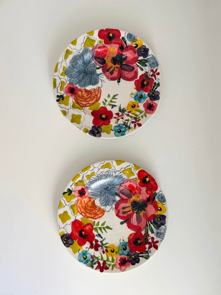 A rare and highly sought-after set of two Anthropologie "Sissinghurst Castle" 8-inch salad/dessert plates. Hand-painted by Estudio Flores, these vibrant ceramic dishes feature a stunning, intricate floral design. They are perfect for serving appetizers, desserts, or for displaying as beautiful wall art or unique decor.
