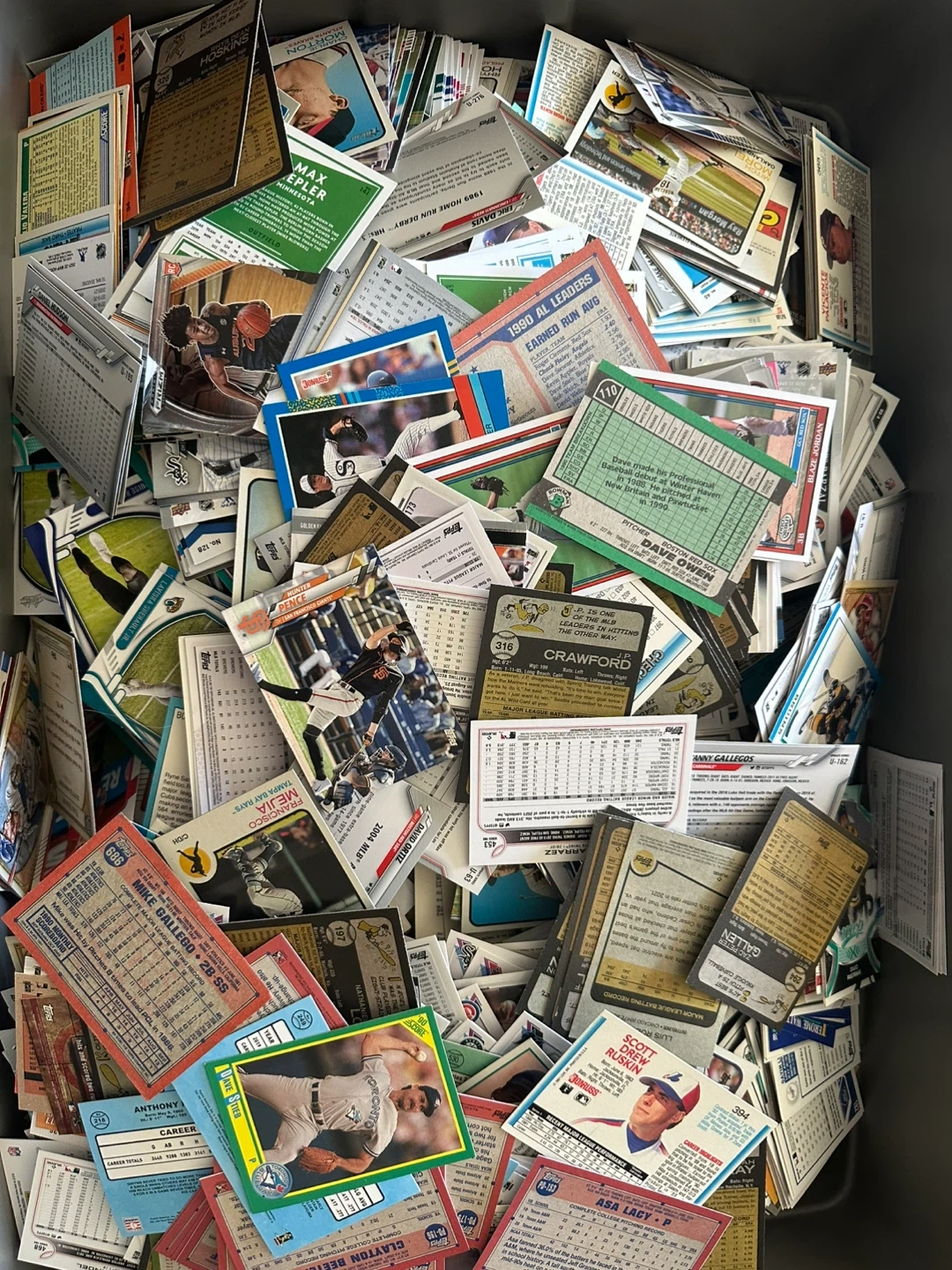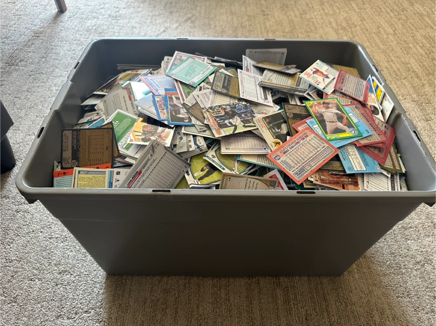 A large collection of assorted baseball, football, basketball, hockey and more trading cards, including rookie cards and various years. The cards are stored in a large plastic bin and a cardboard box.