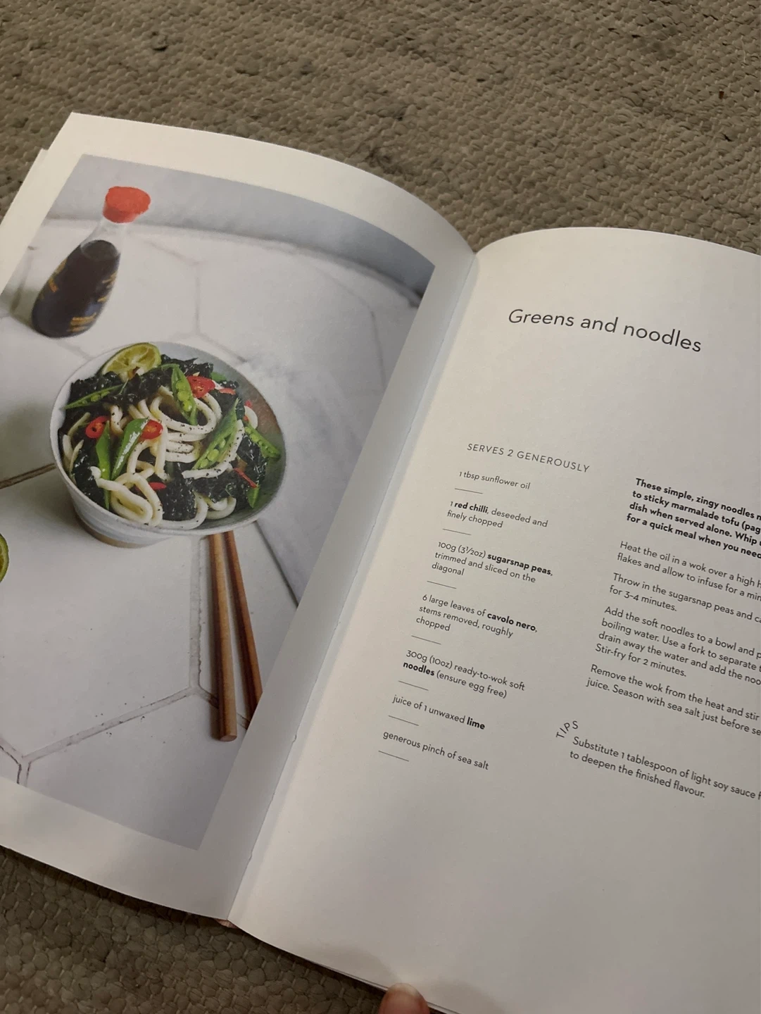This cookbook features 100 simple, fast, modern vegan recipes. It includes dishes like 'Greens and noodles' that serve two generously. Great for quick weeknight meals!
