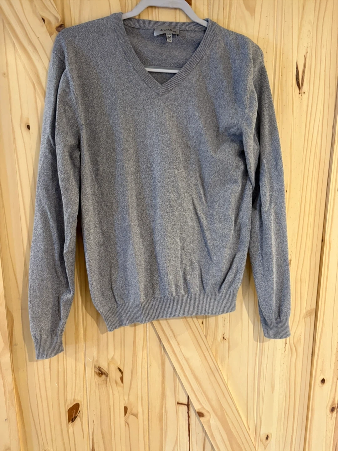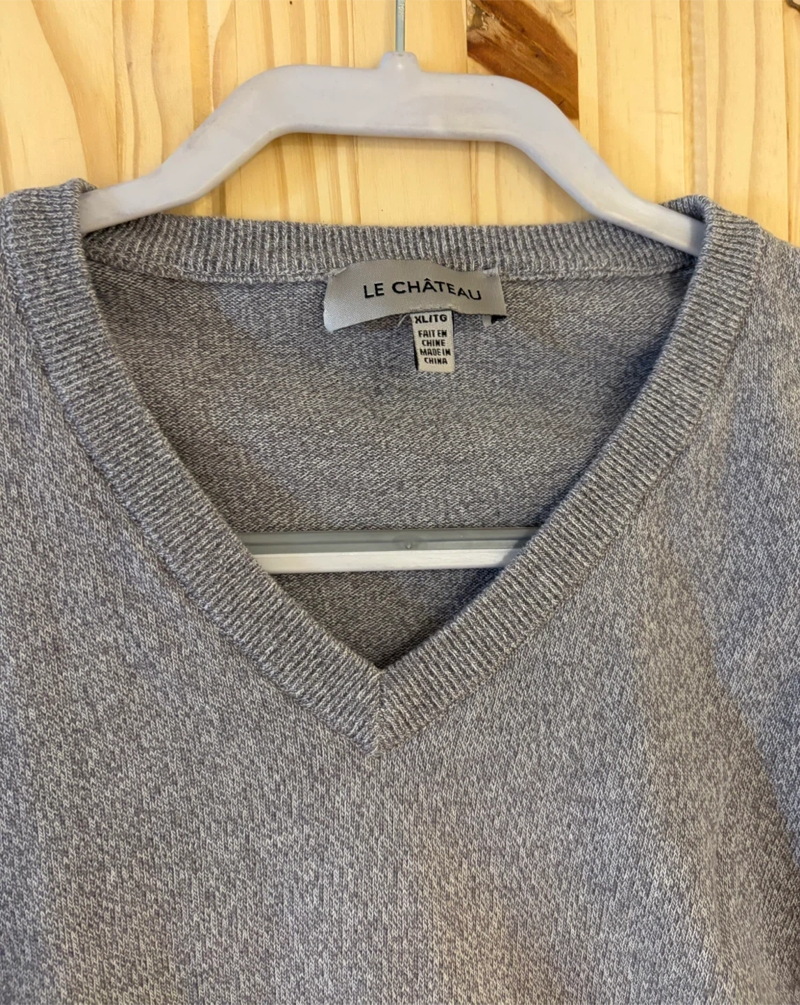 3. Le Chateau Stay stylish classic gray V-neck sweater.