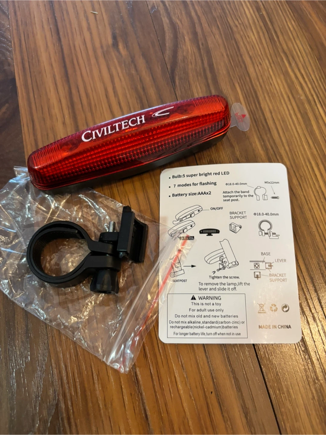 Civiltech bike rear light with 5 super bright red LEDs. It features 7 flashing modes and uses AAAx2 batteries. Includes a seat post mounting bracket. Never used.