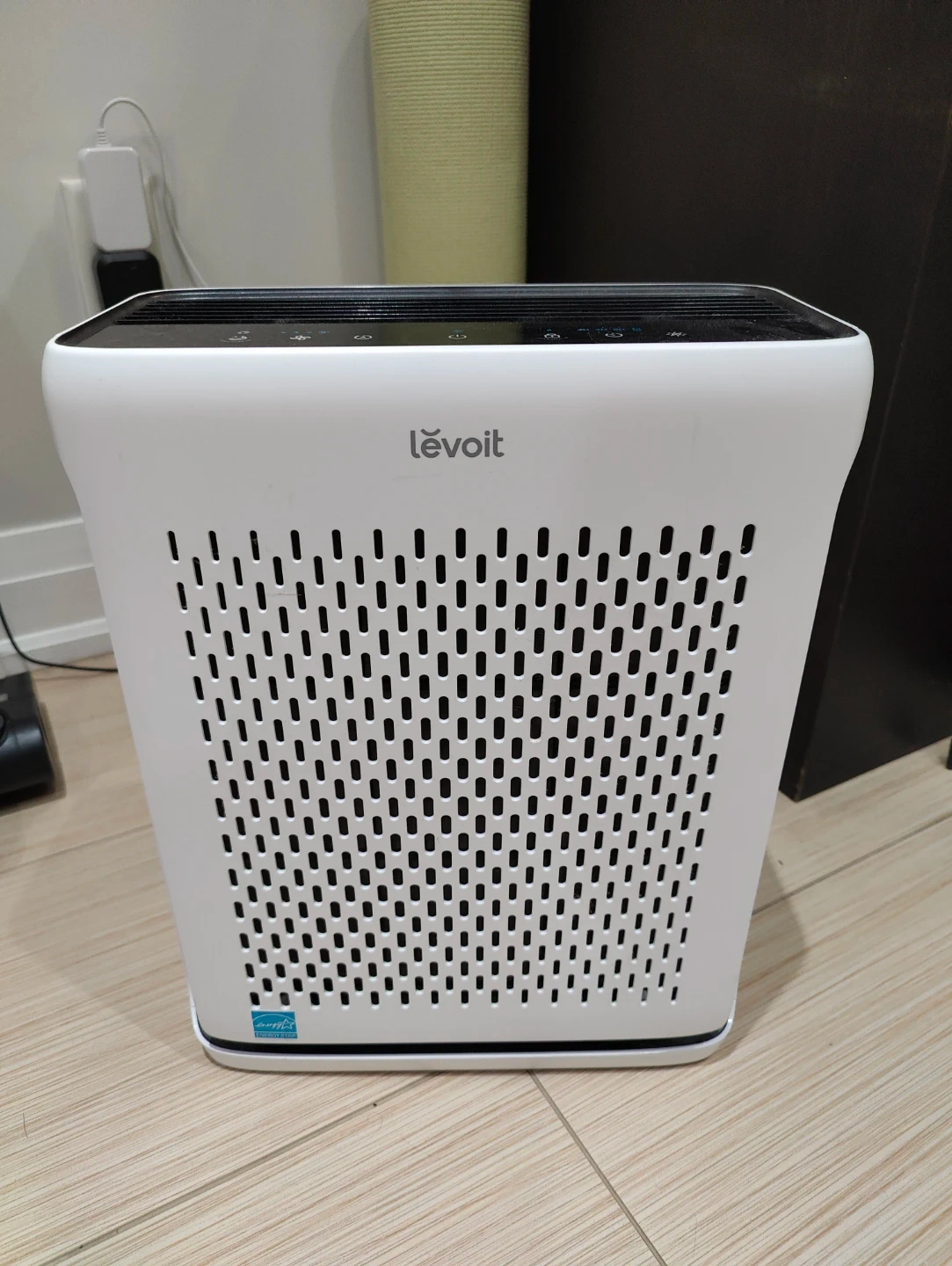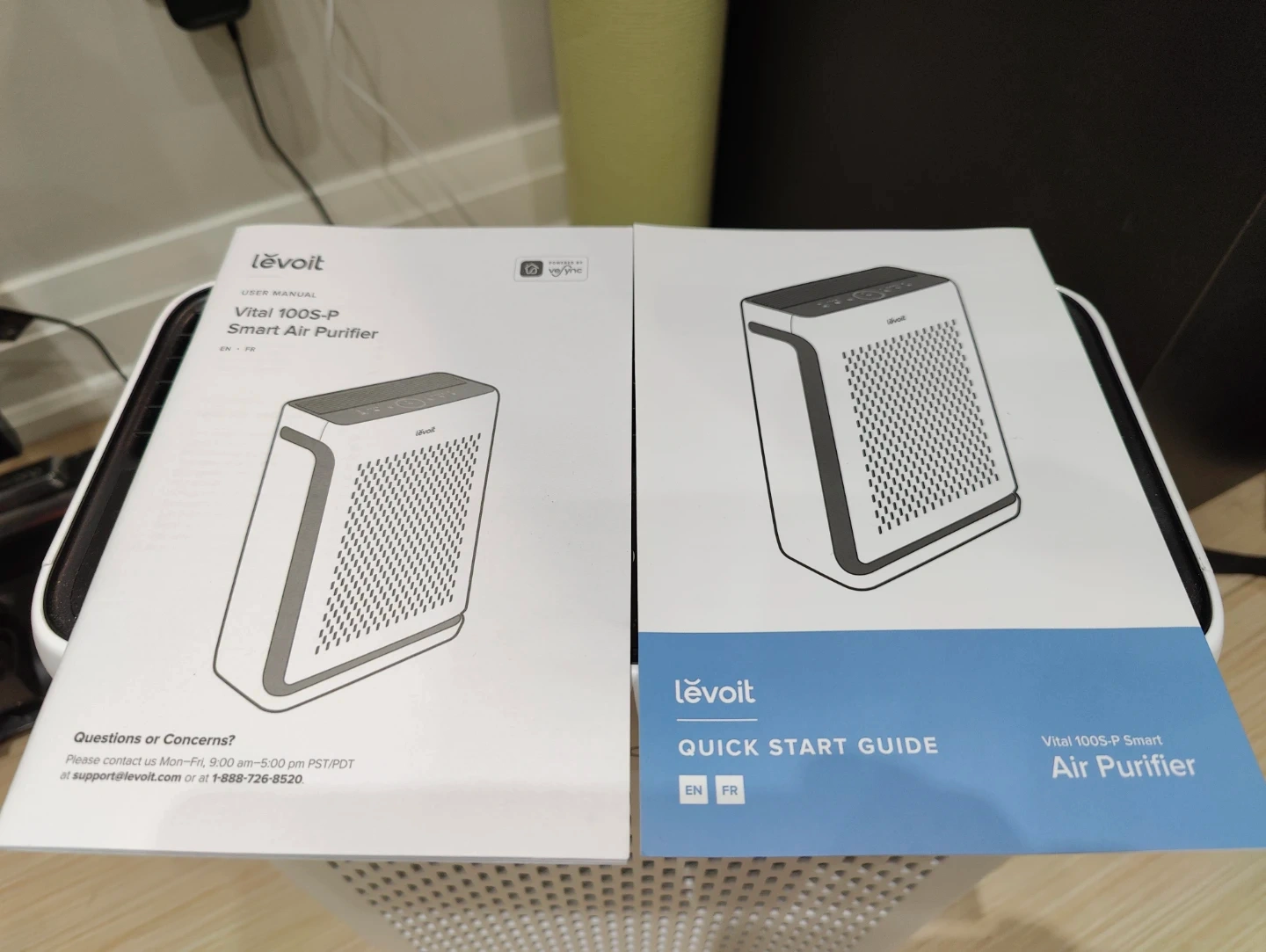 Features washable pre-filter, different modes, air quality indication, and control with companion app. Manual and quick start guide included.