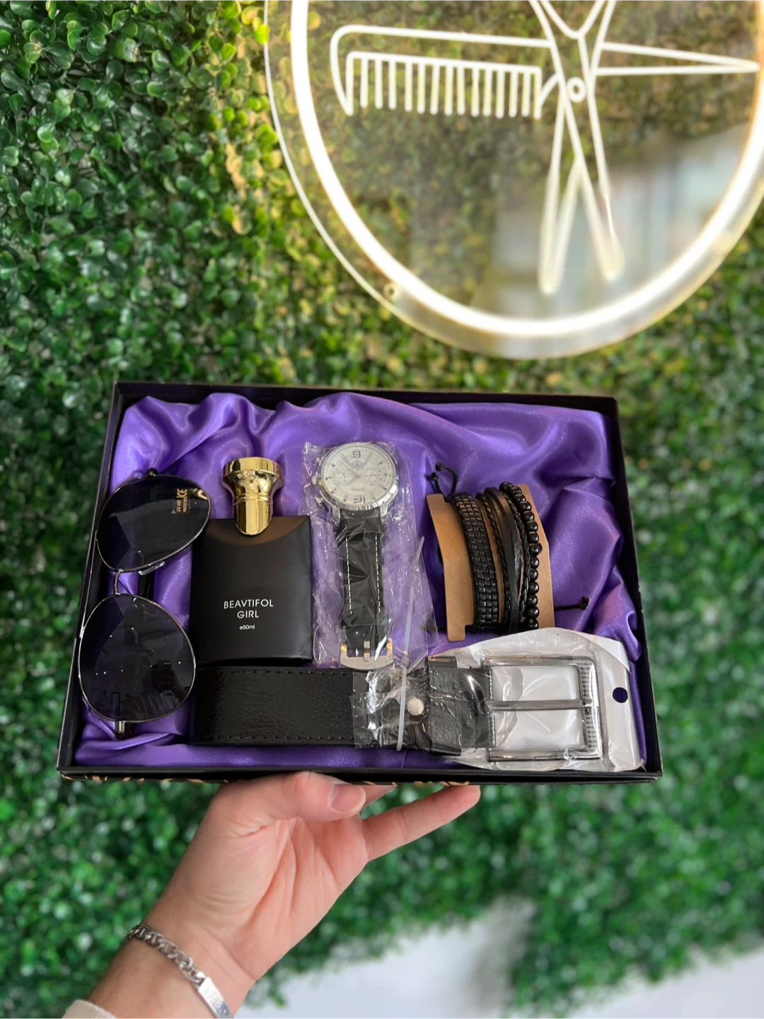 This gift set includes a watch, a pair of sunglasses, a belt, a bracelet, and a bottle of fragrance. All items are presented in a box with satin lining. It's a nice collection of accessories for everyday use or special occasions.