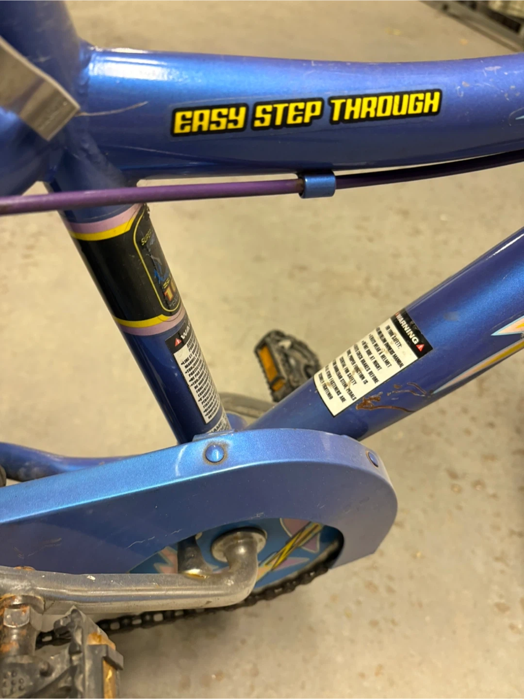 This blue Razor bicycle is designed for kids with its easy step-through frame. It features a bell and a mirror for added fun and can be included. The bike has knobby tires for good grip.