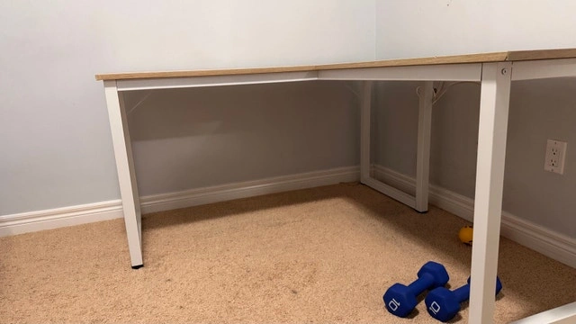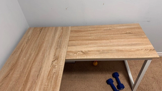 Modern L-shaped desk with wood-finish top and white metal frame. Great for a home office or gaming setup.