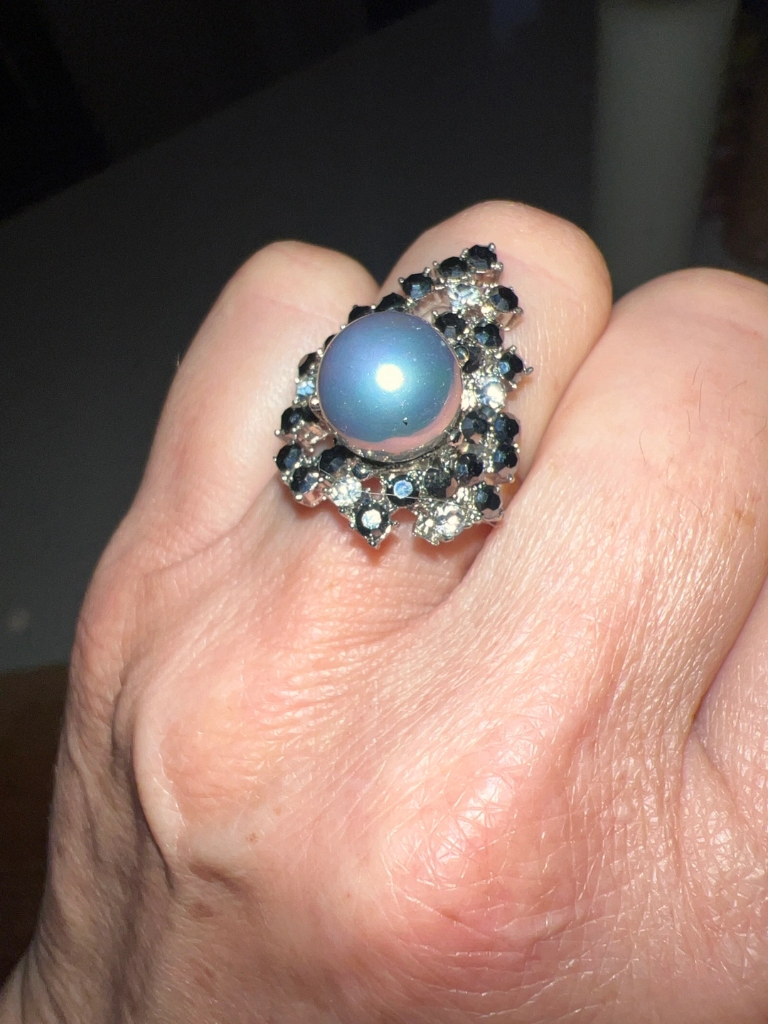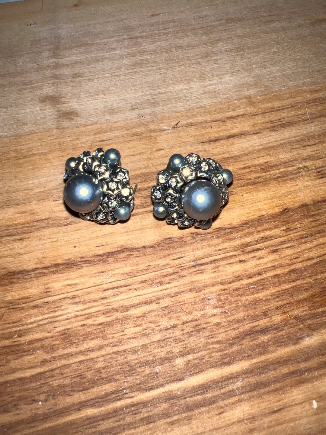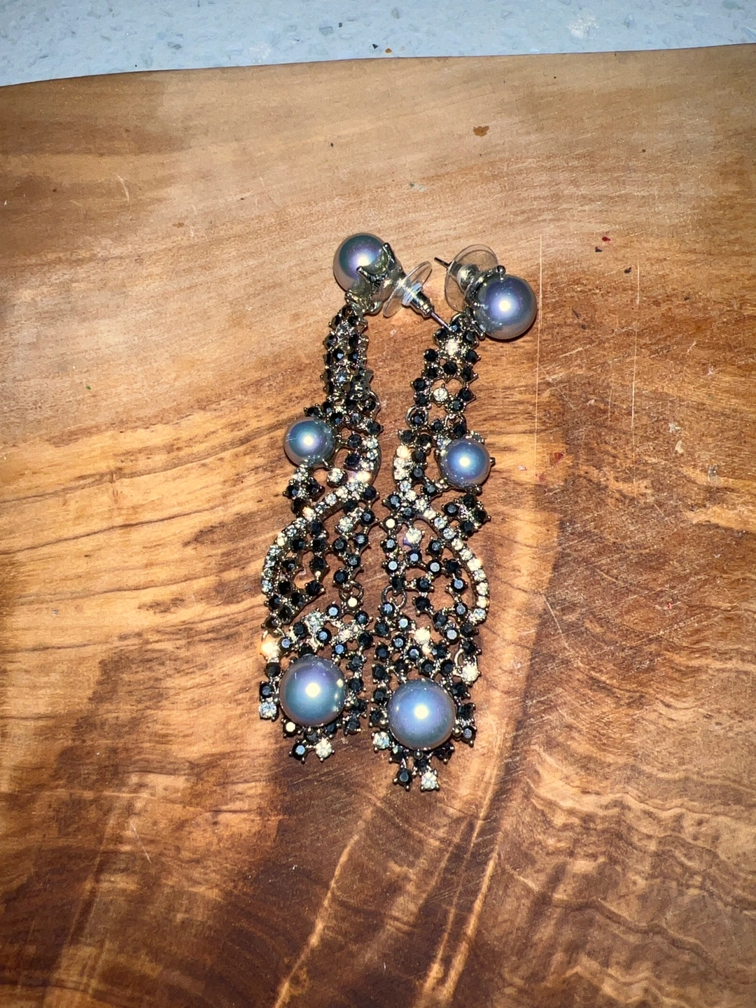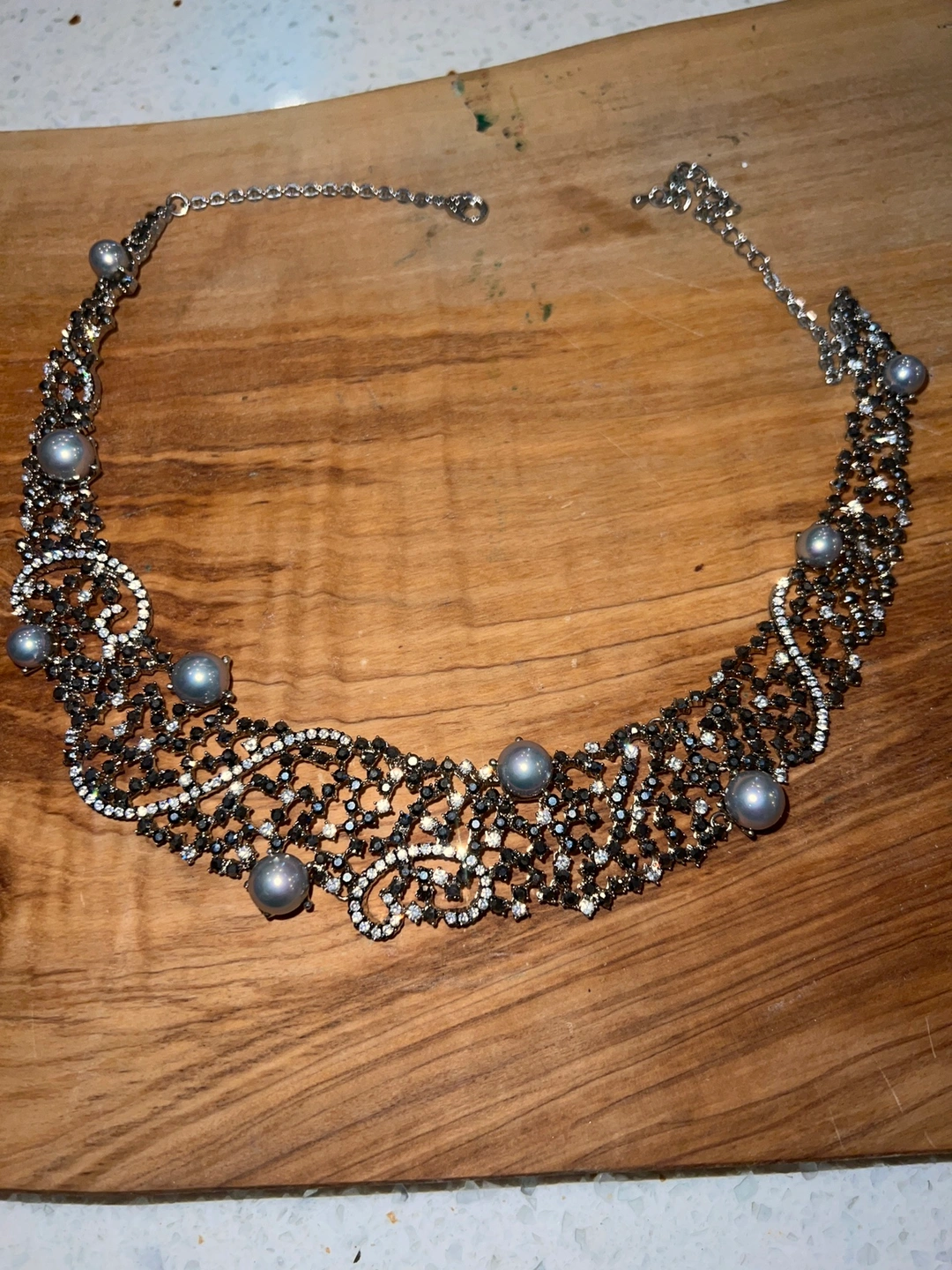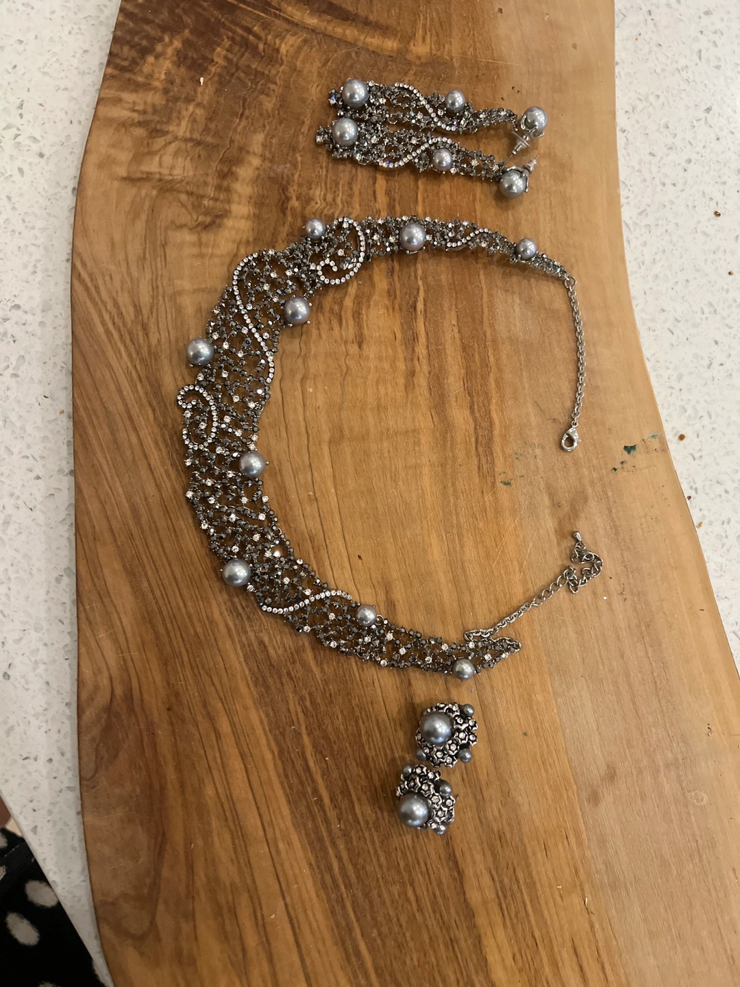 This set features a beautiful silver-toned necklace and matching earrings. The necklace and earrings are adorned with crystals and pearls.