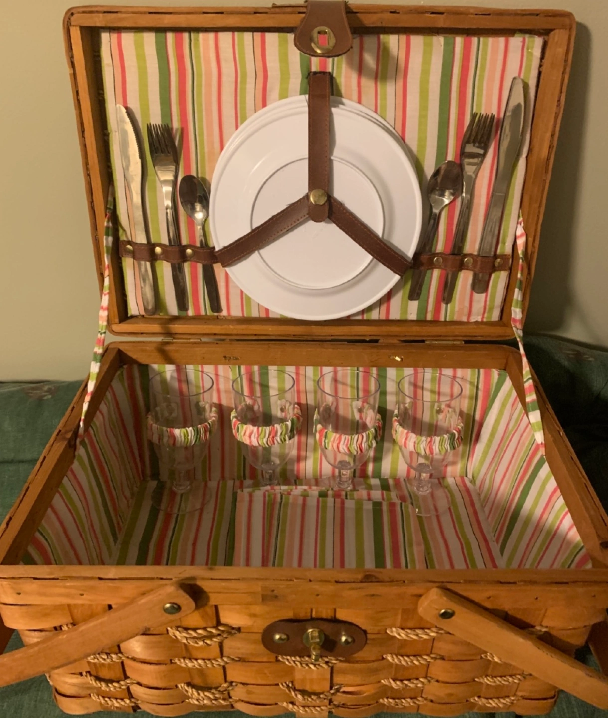 Wooden picnic basket. Rope detailing. Leather accents. Includes plates, cutlery, and glasses. Great for outdoor events.