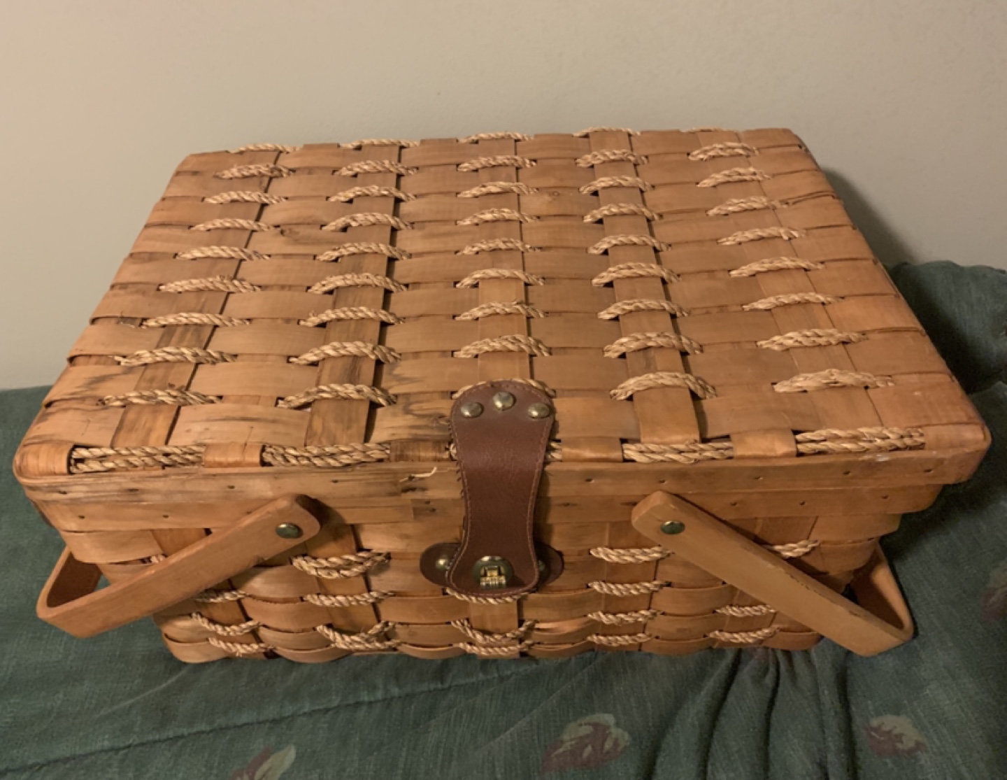 Wooden picnic basket. Rope detailing. Leather accents. Includes plates, cutlery, and glasses. Great for outdoor events.