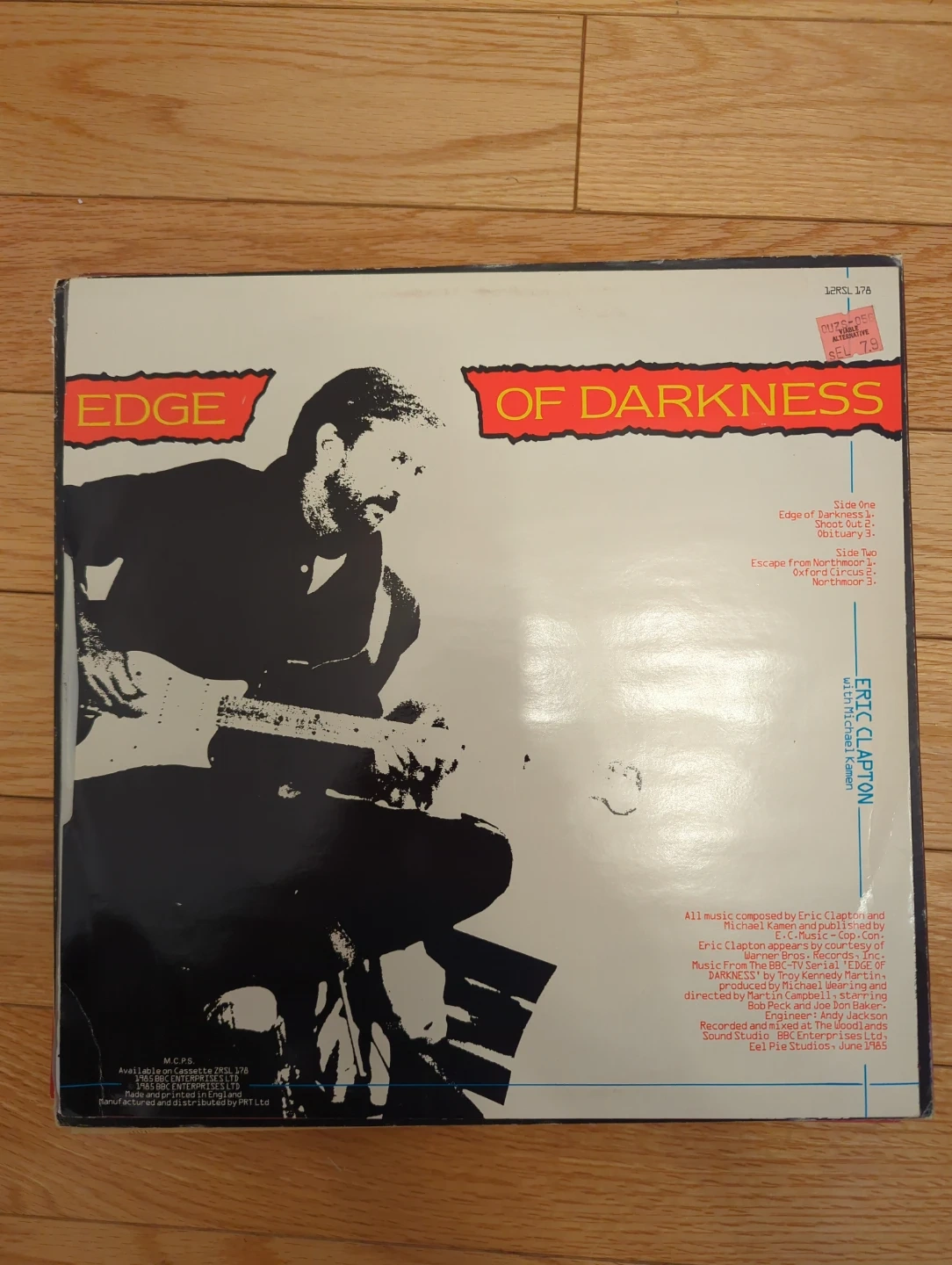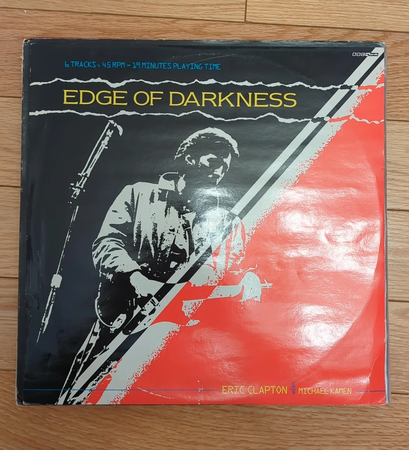 This is Eric Clapton's "Edge of Darkness" vinyl record. It features 6 tracks with a total playing time of 19 minutes. The record includes music composed by Eric Clapton and Michael Kamen.
