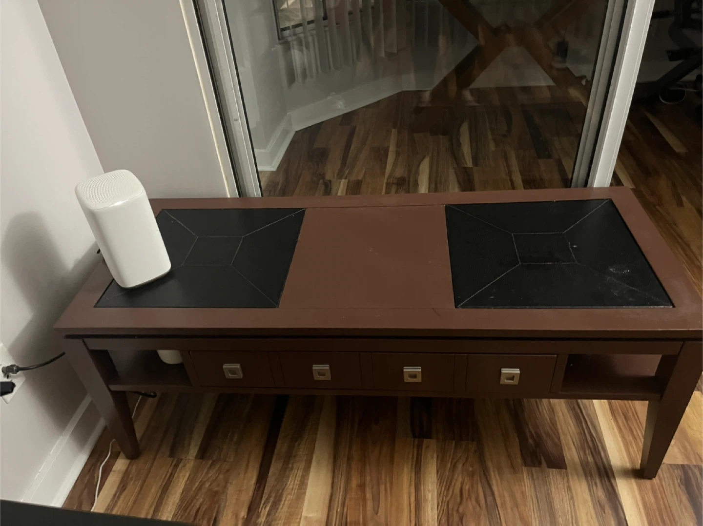 Here's a lovely brown coffee table with some handy drawers for storage! The top has two black square inlays. It's in great shape