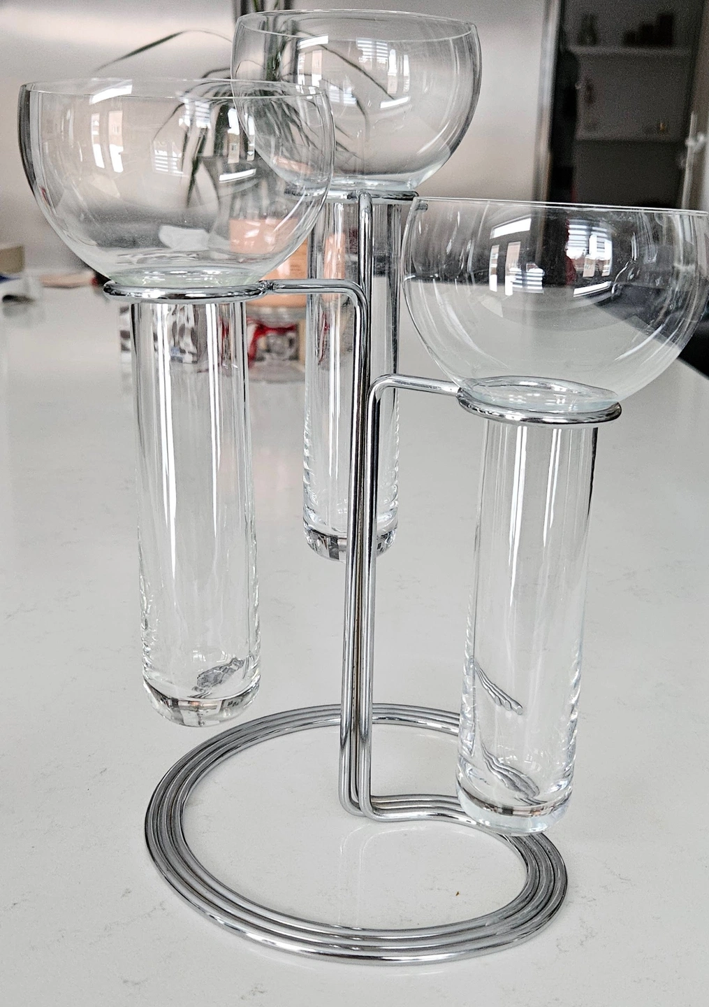 Glass candle holders in chrome stand. Designed by Timo Sarpaneva and Johannes Dinnebier.