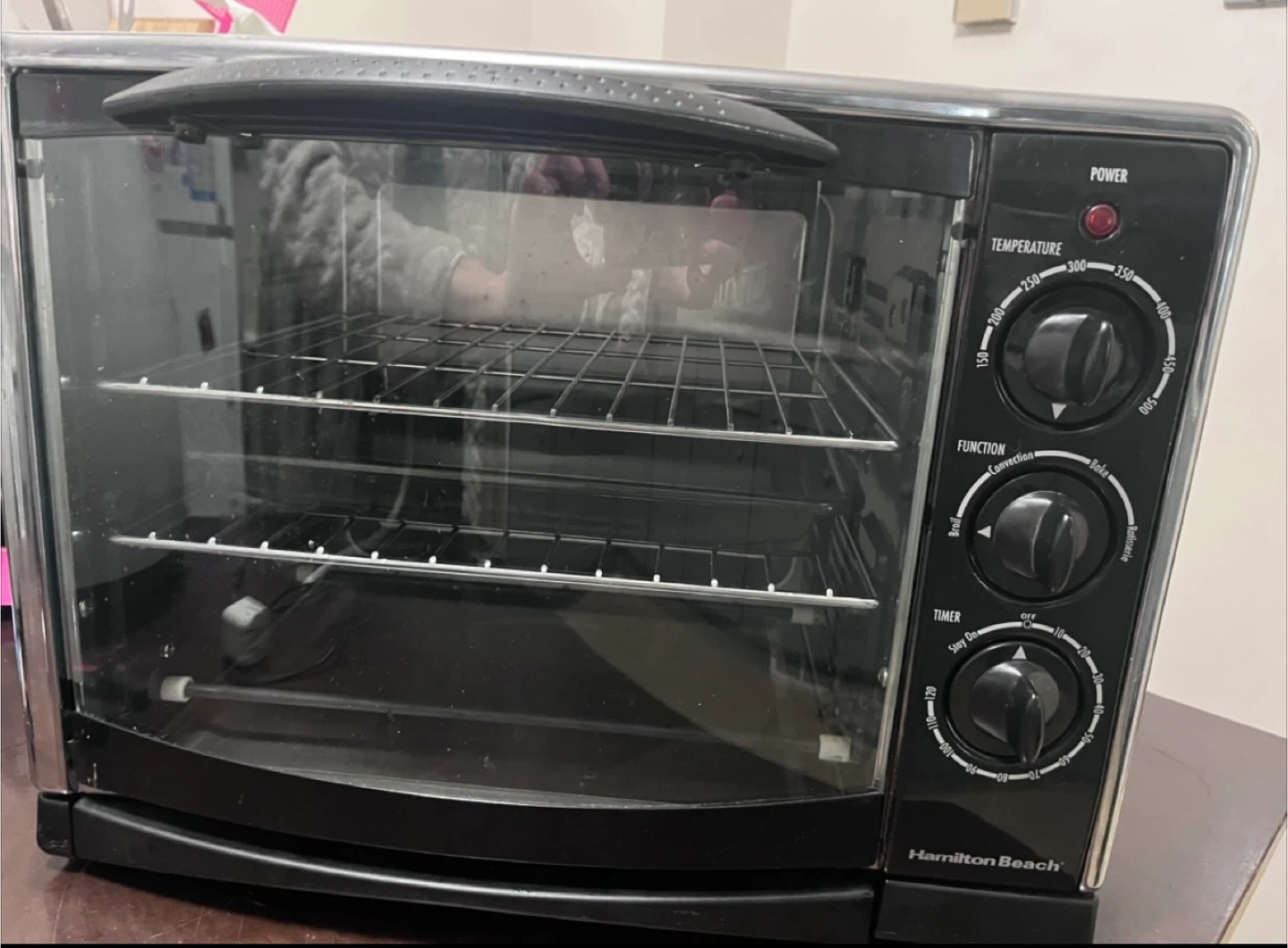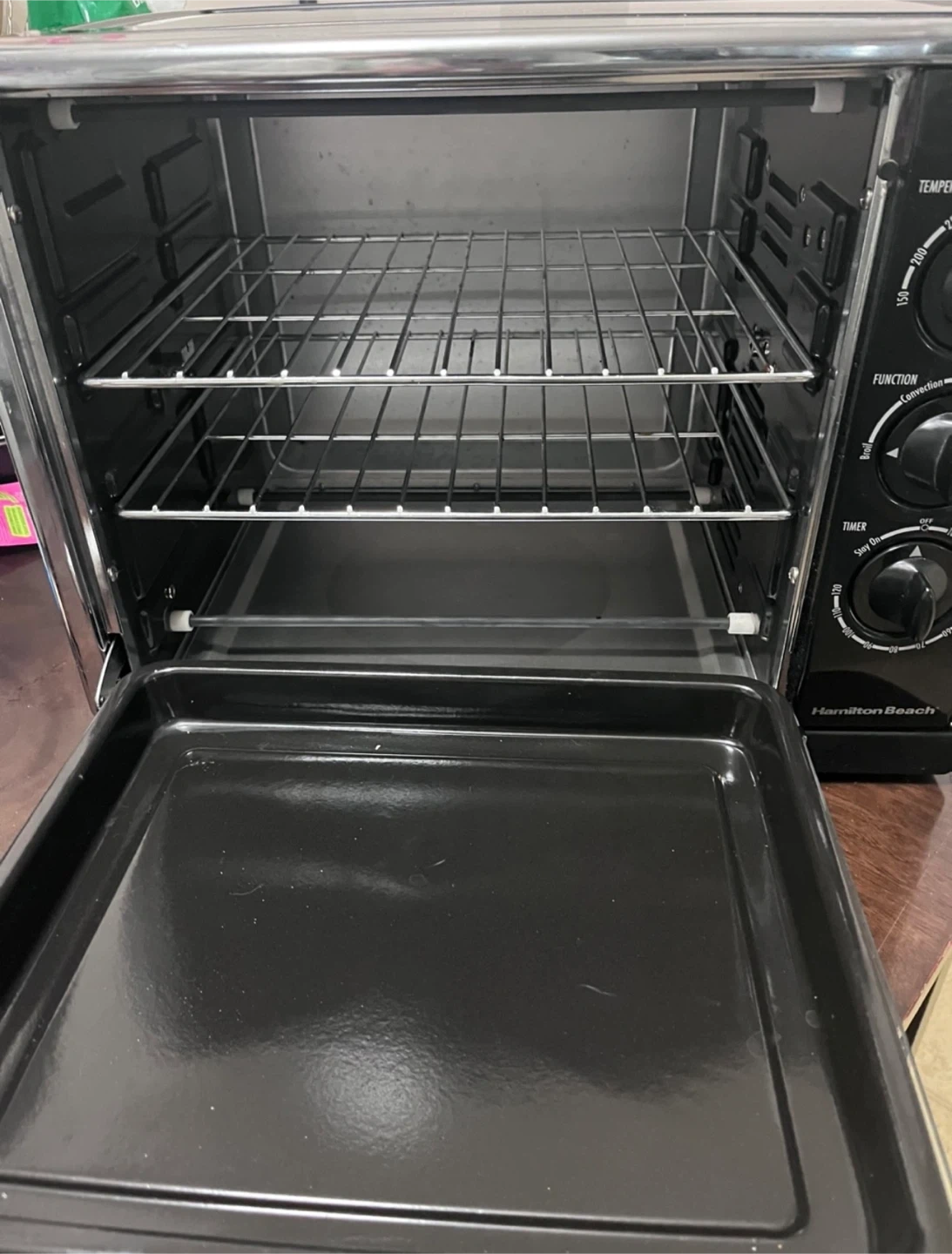 Black Hamilton Beach Countertop Convection Toaster Oven. Features convection, bake, broil and rotisserie functions. Large capacity. Includes a baking pan, 2 wire racks, and a removable crumb tray. Adjustable cooking timer and temperature controls, as well as a stay-on setting with auto shutoff. Easy to clean. This convection toaster oven gives you all the counter cooking convenience you love in a toaster oven. In addition to traditional toasting, baking, and broiling, convection cooking lets you cook great tasting evenly cooked foods in the oven. Excellent condition, like new. Used only once. From smoke-free, pest-free, and pet-free home.