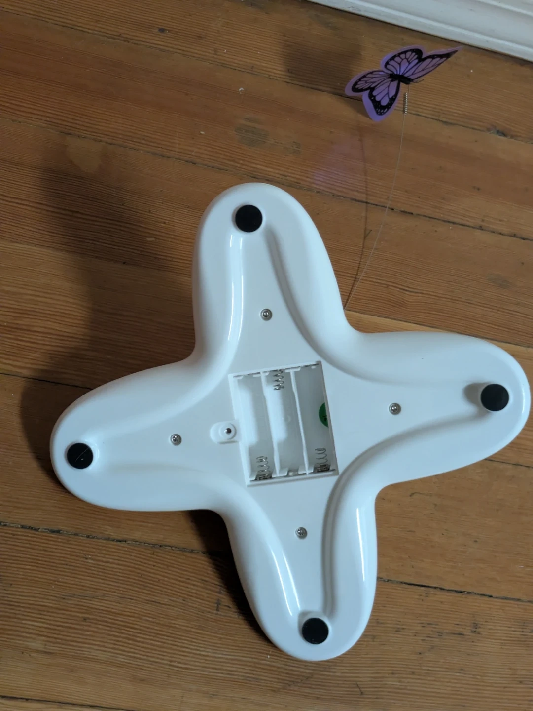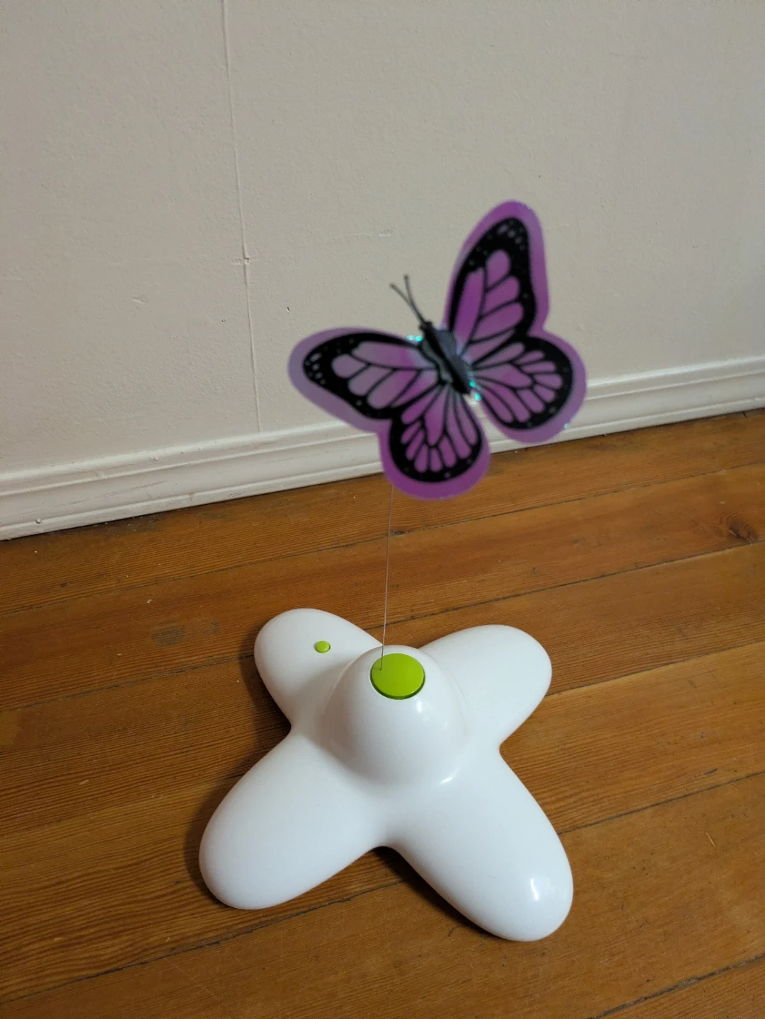 This interactive cat toy features a fluttering butterfly on a flexible wire. It has a simple on/off button and requires AA batteries (not included). Missing the battery cover but hasn't made the batteries fall out.