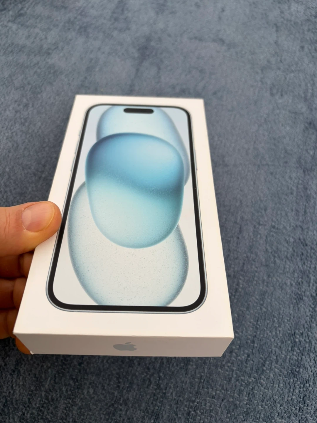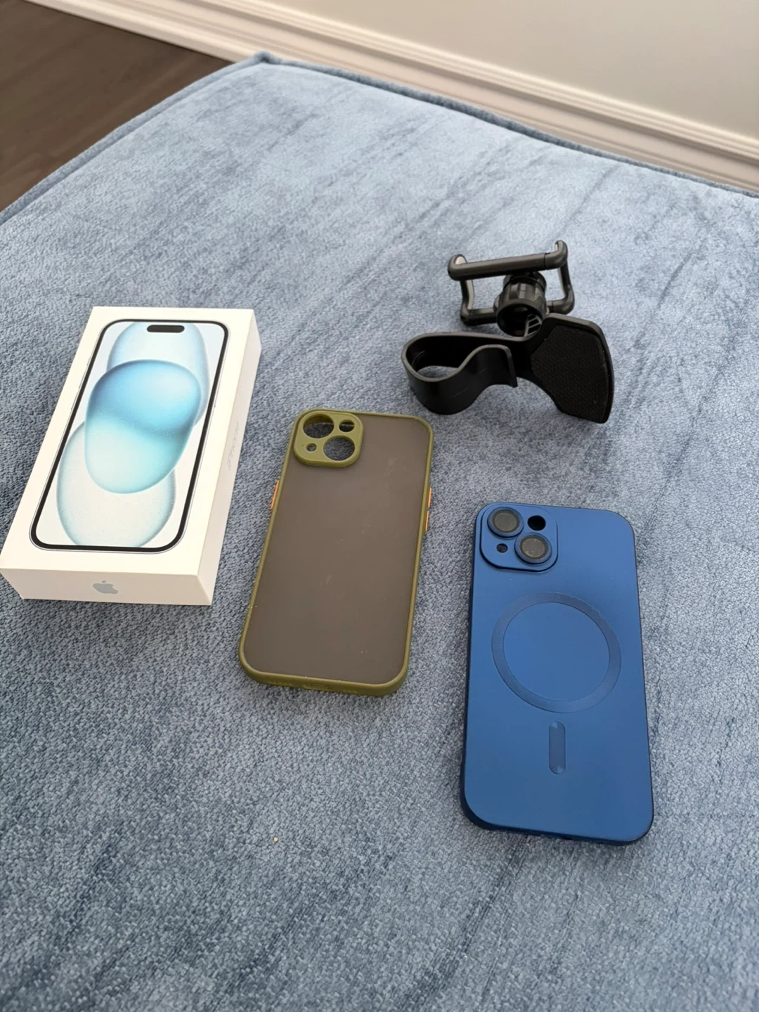 Two phone cases for an iPhone 15, one blue with MagSafe and one brown/green. Includes the original box and a car mount. Get great protection and convenience!
