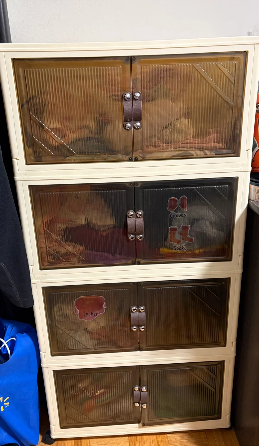 This is a 4-drawer storage cabinet with a cream-coloured frame and translucent amber doors. Each drawer has a small brown faux-leather pull. Labels on the drawers indicate 'Gloves', 'Socks', and 'Jacket' areas. It's great for organizing clothes or accessories!