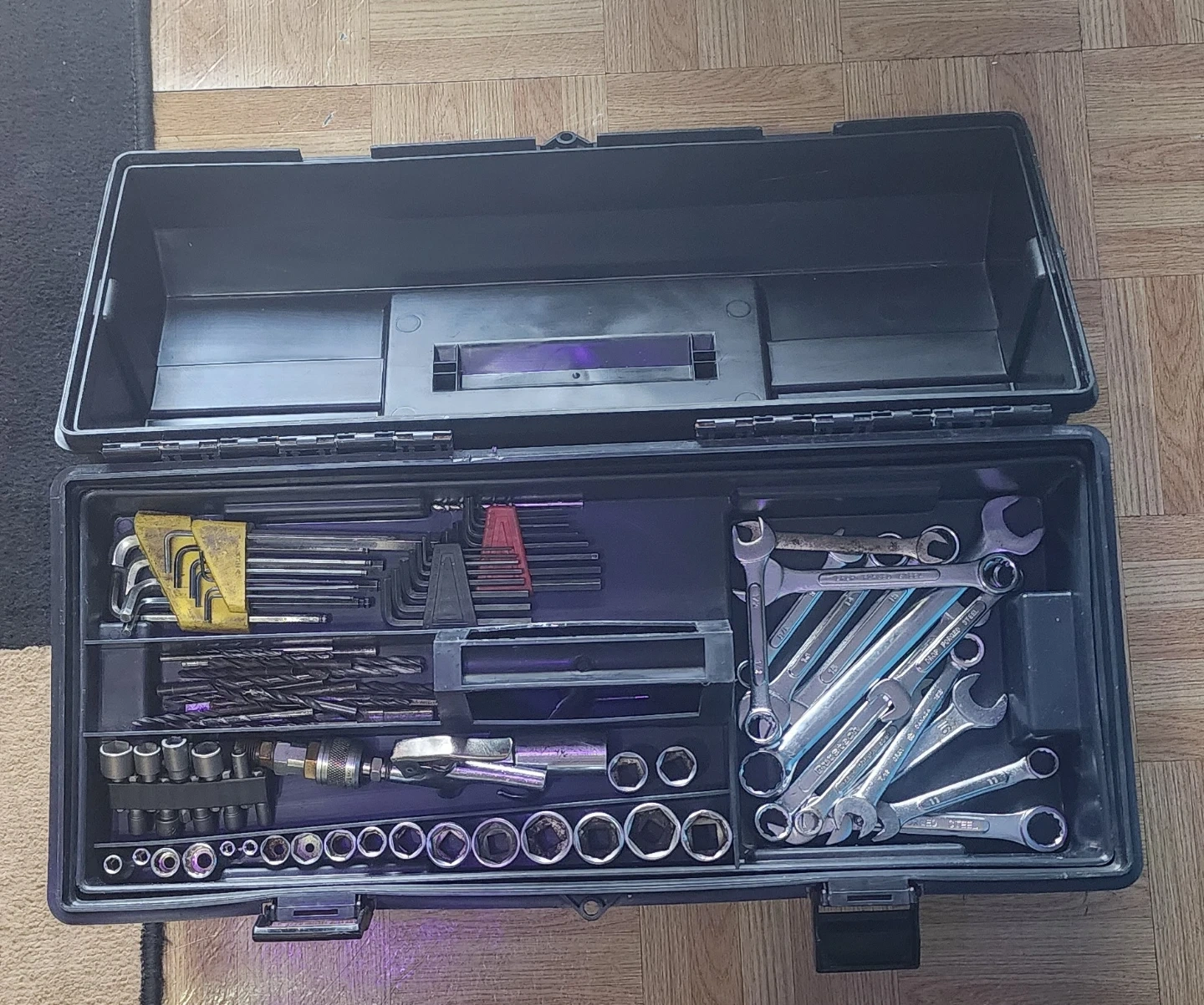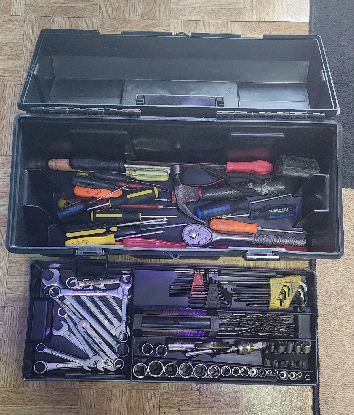 Selling collection of assorted hand tools, including wrenches, sockets, screwdrivers, and drill bits, all organized in a black plastic toolbox. It's a versatile set for various mechanical tasks. The toolbox itself is durable and portable, making it easy to transport your tools.