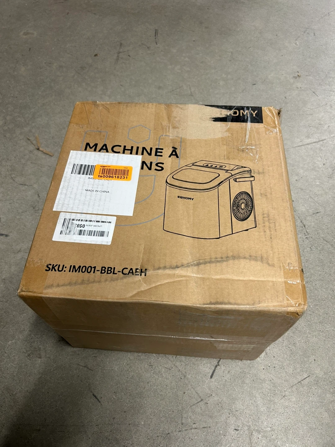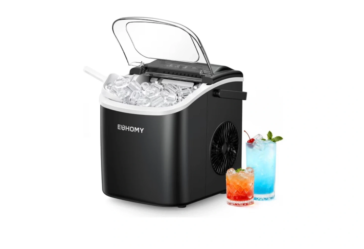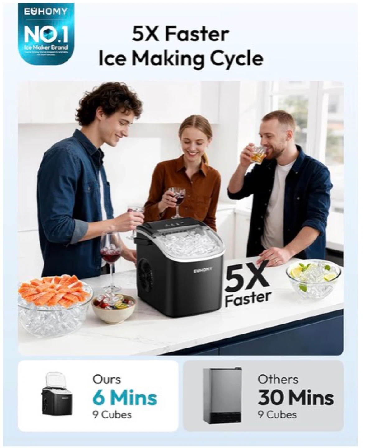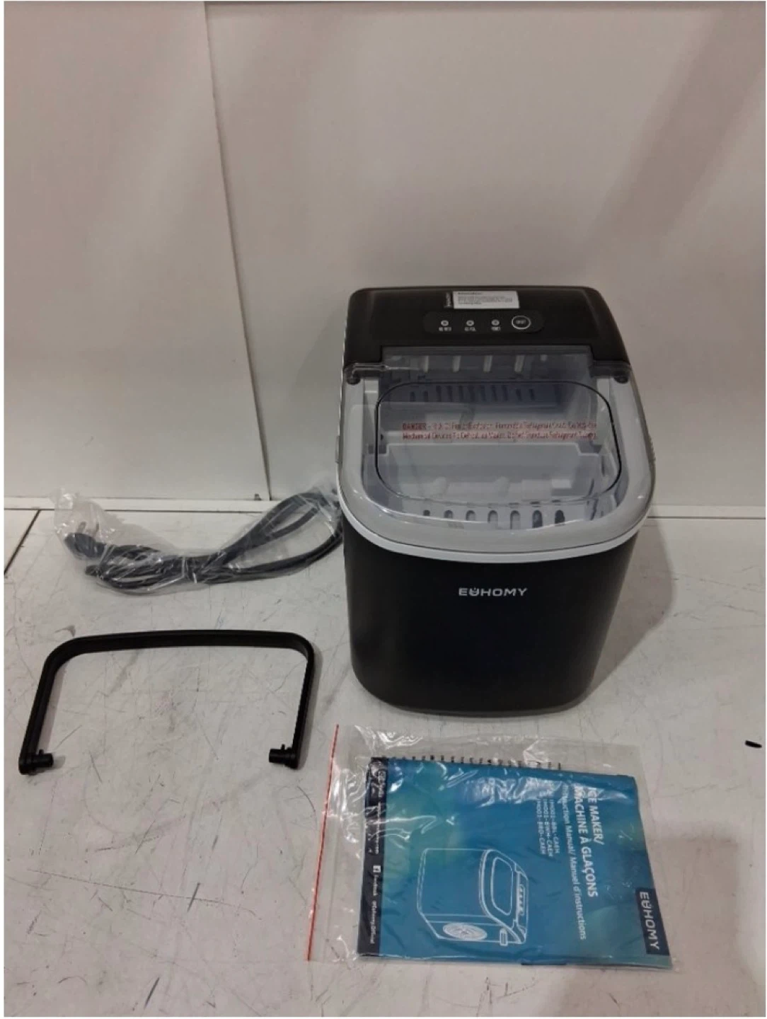 This is a EuHomy portable ice maker. It's black and comes with an ice scoop and manual. It makes ice in as little as 6 minutes!