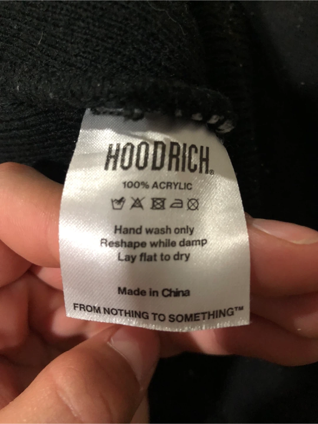This is a black HOODRICH beanie. It's made of 100% acrylic. Hand wash only and reshape while damp. Lay flat to dry.
