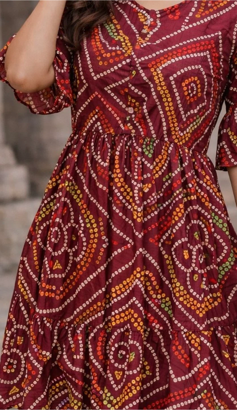A pretty dress with a unique pattern and a lovely burgundy colour. It looks like it would be very comfortable to wear!