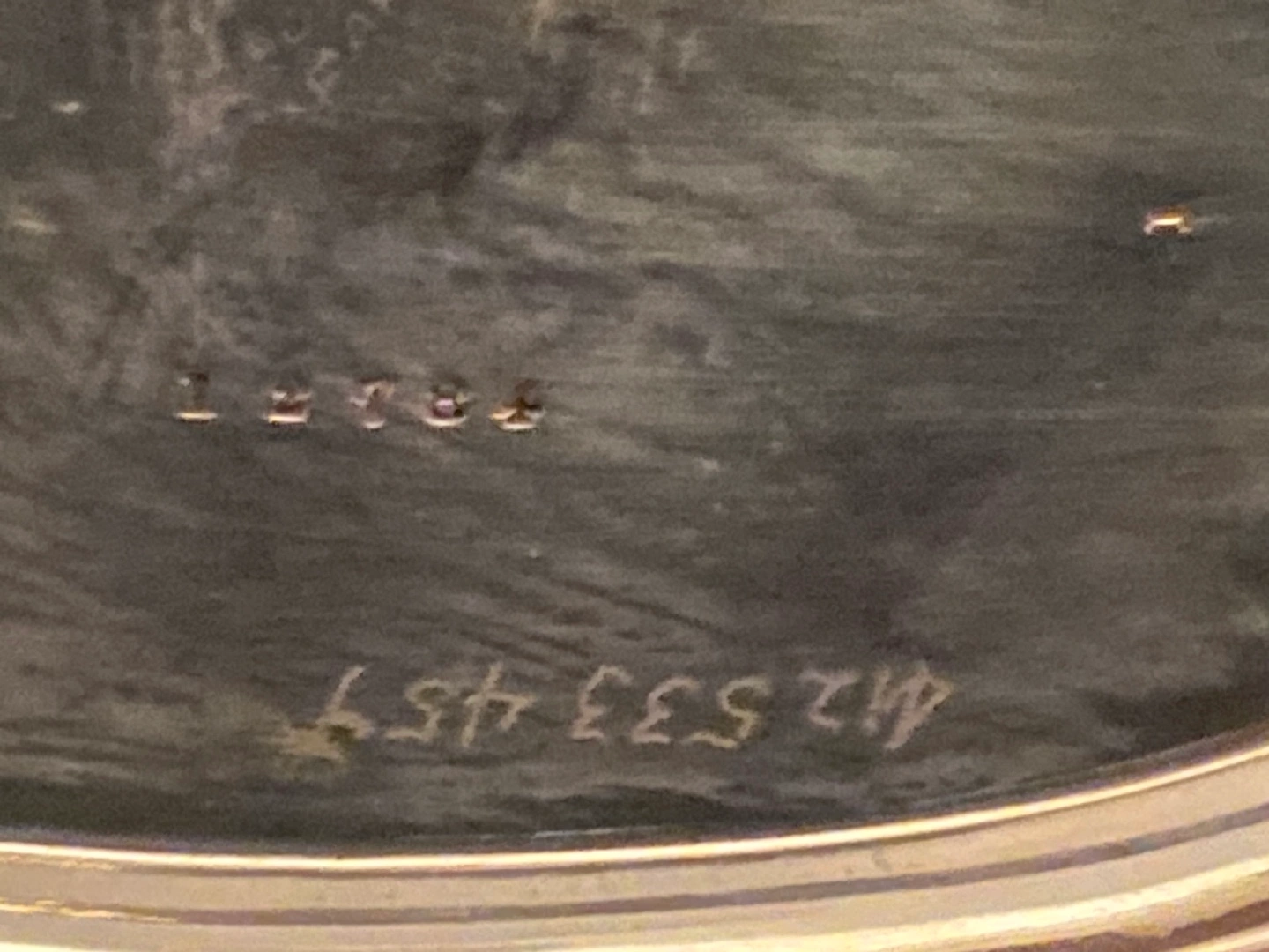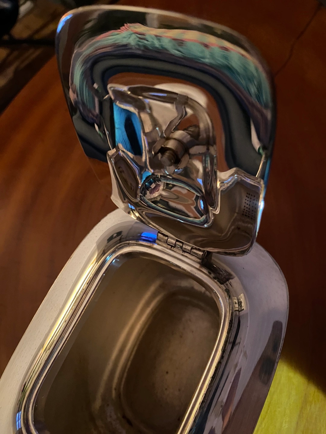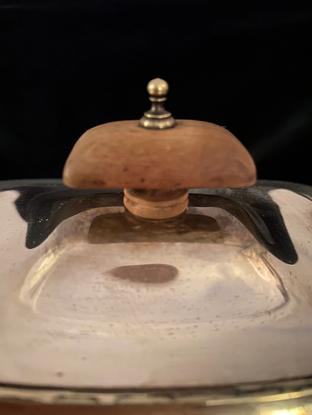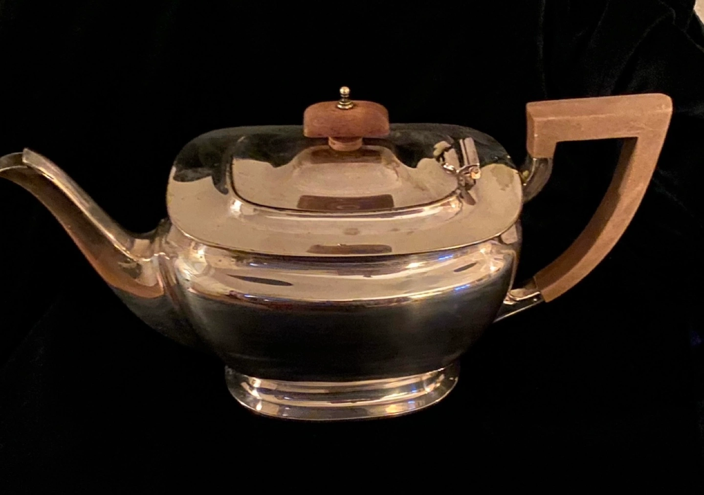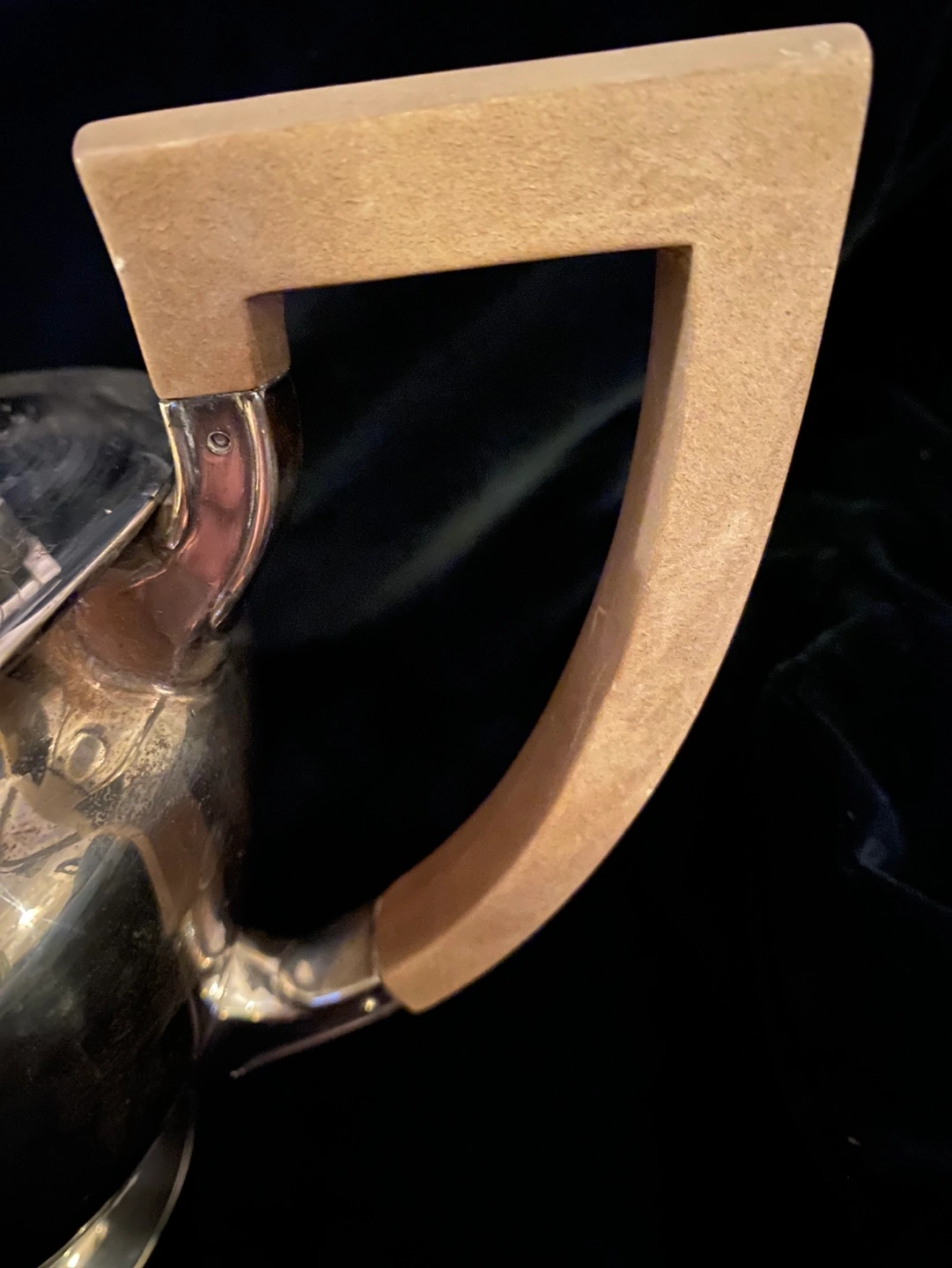 Vintage silver deco style teapot with a wood handle and knob. Has a pedestal base and a rounded body.