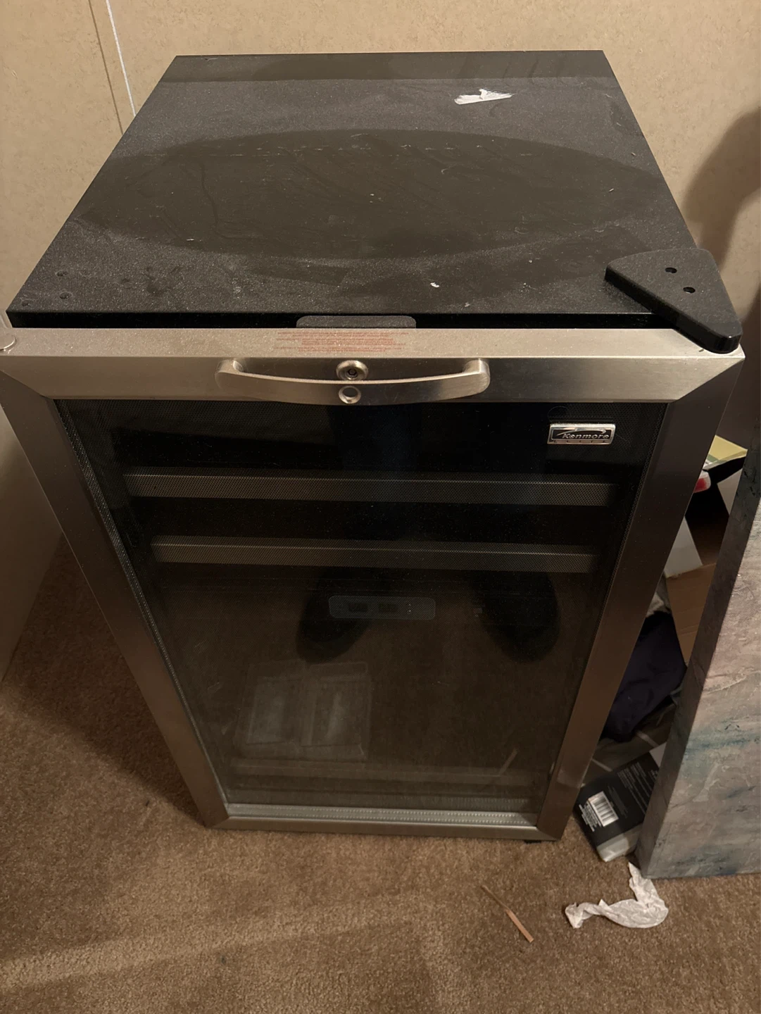 This is a Kenmore wine cooler. It has a glass door and stainless steel trim. It includes shelves for storing wine bottles.