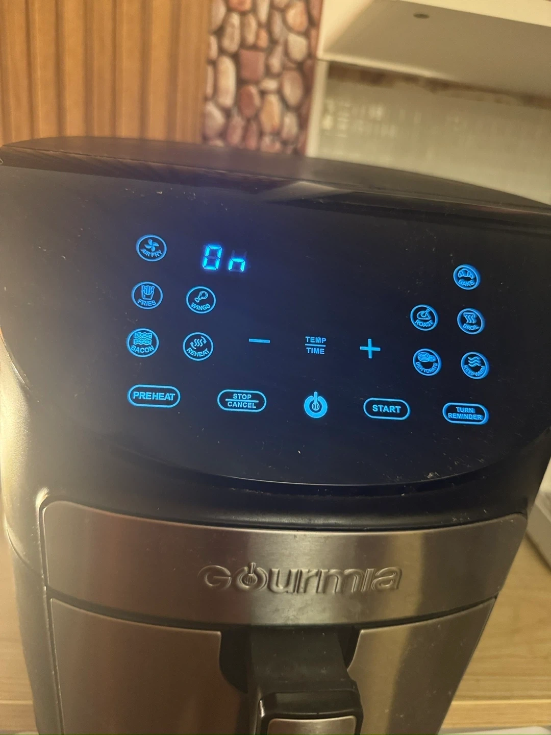 Gourmia air fryer with preheat function. It has various cooking presets for fries, fish, poultry, bacon, steak, and shrimp. Temperature and time controls are adjustable. The basket is removable for easy cleaning. It's great for quick meals and snacks!