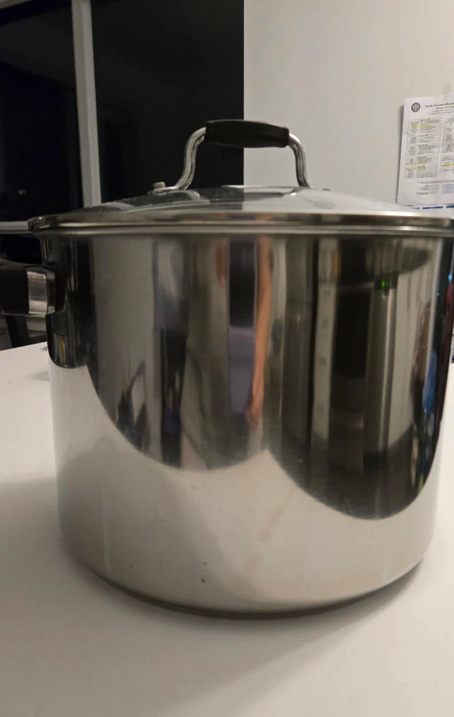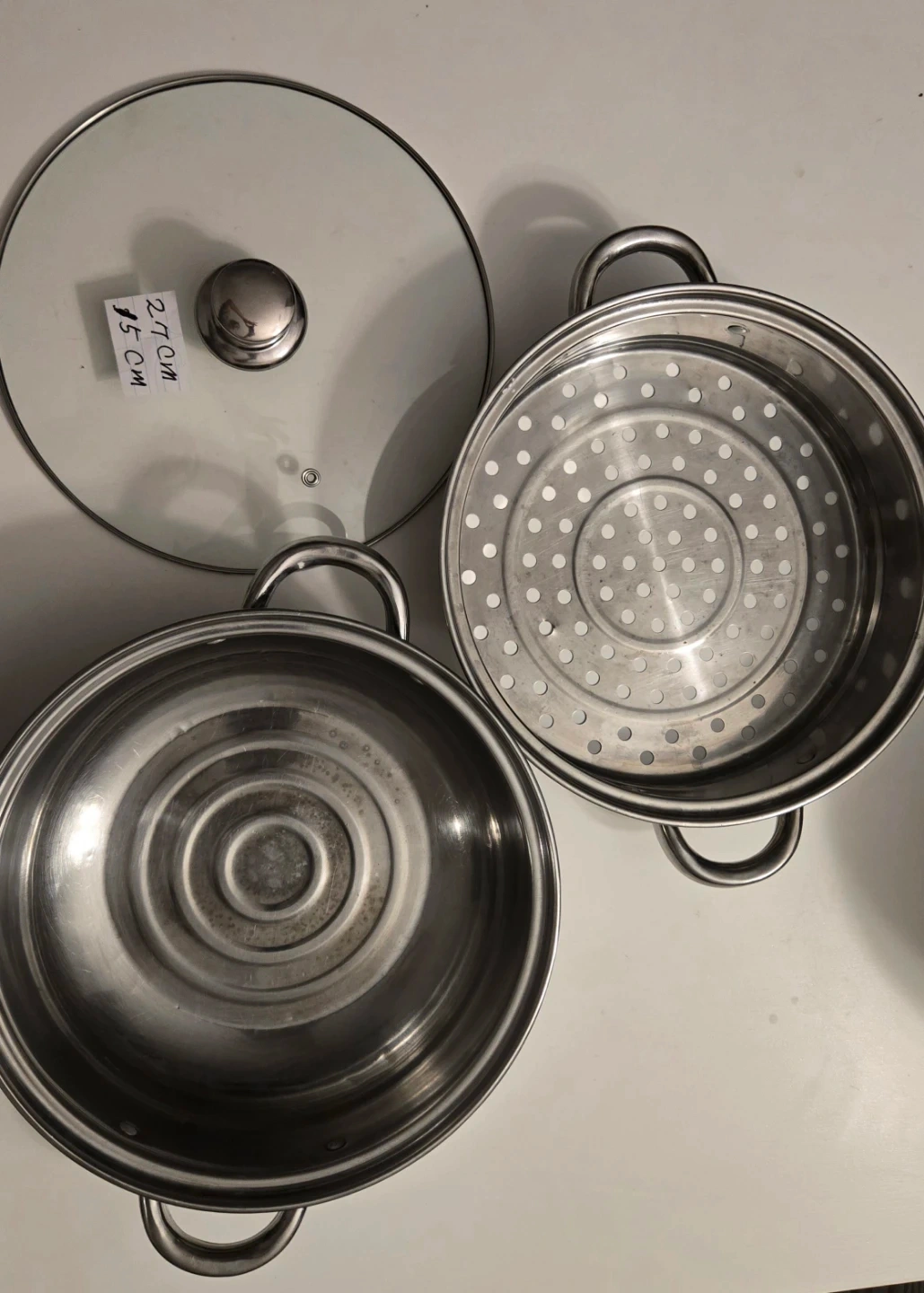 A stainless steel steamer pot set. It includes a large pot, a steamer insert, and a glass lid. The pot is 27cm in diameter and 20cm tall. The steamer insert is 15cm tall.