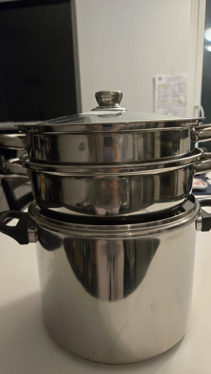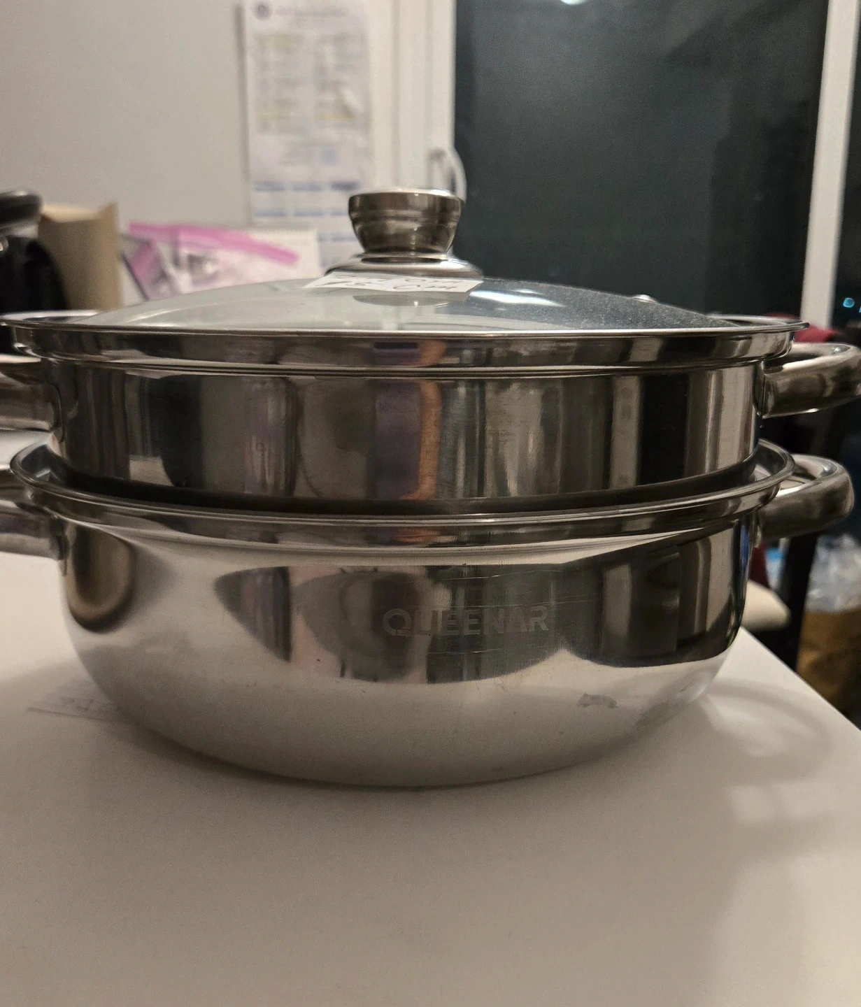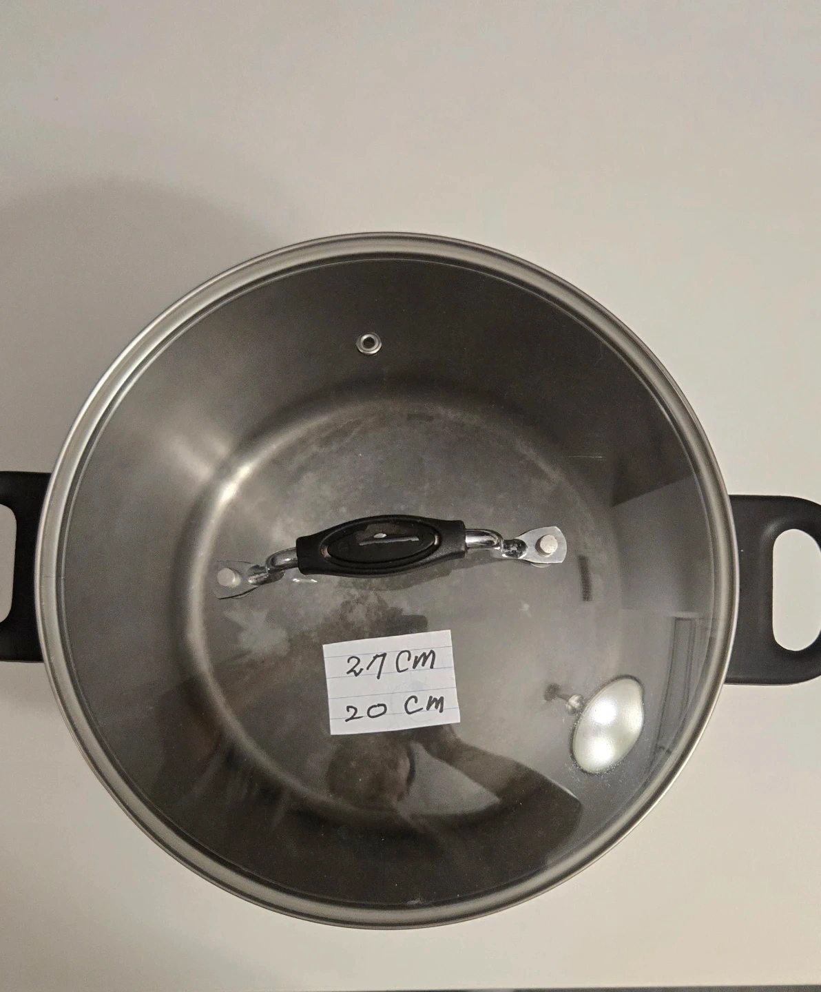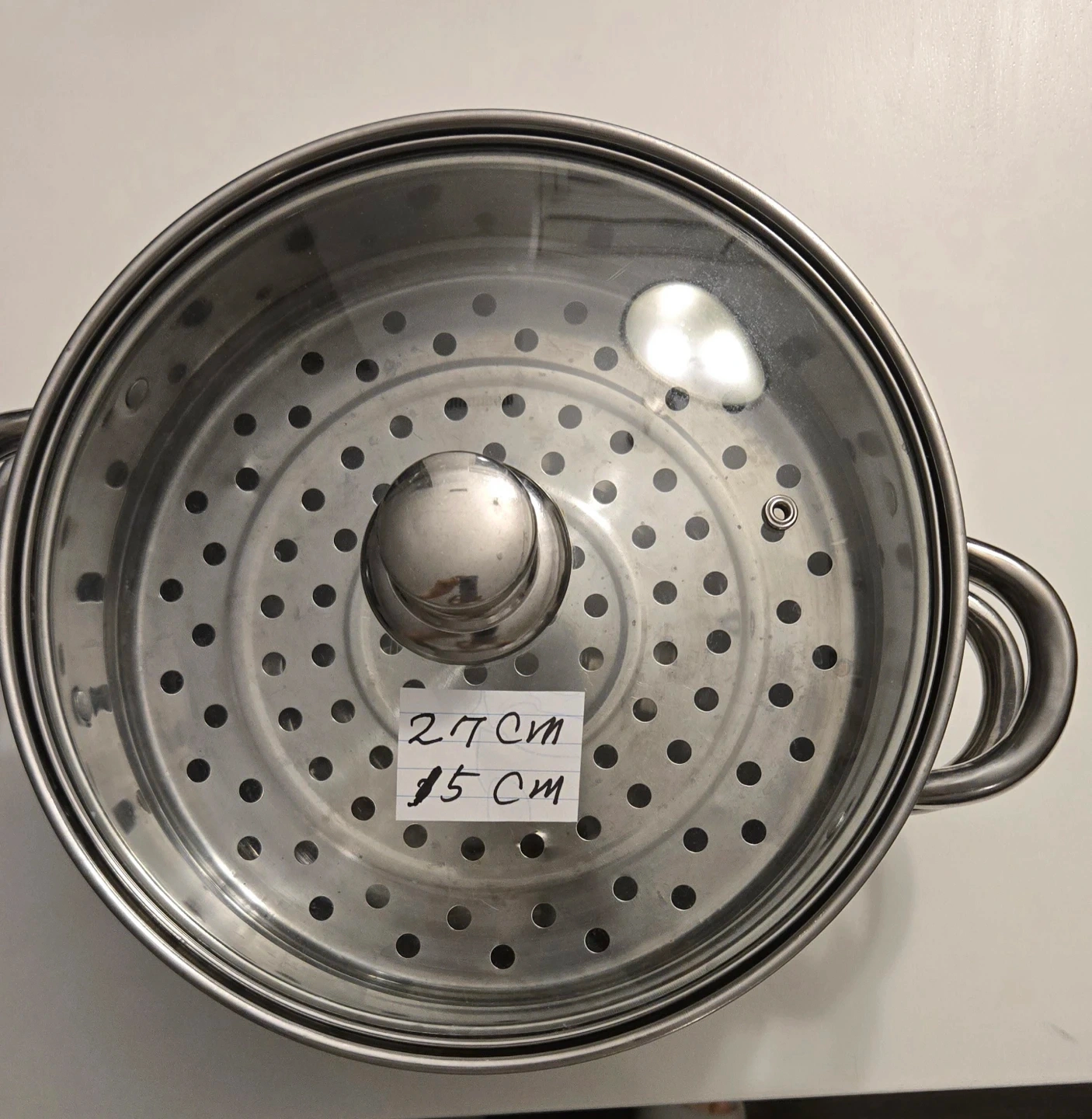 A stainless steel steamer pot set. It includes a large pot, a steamer insert, and a glass lid. The pot is 27cm in diameter and 20cm tall. The steamer insert is 15cm tall.