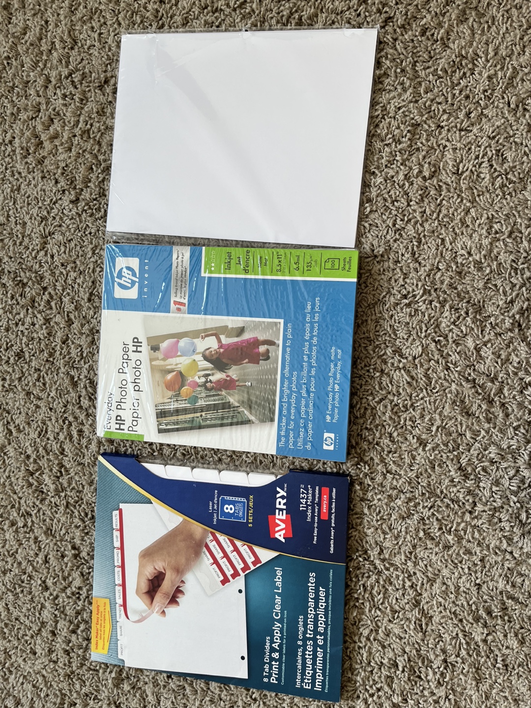 I have a package of Avery Index Maker Tab Dividers and a package of HP Everyday Photo Paper. Both items are sealed. This set is a great way to organize and print your photos for years to come.
