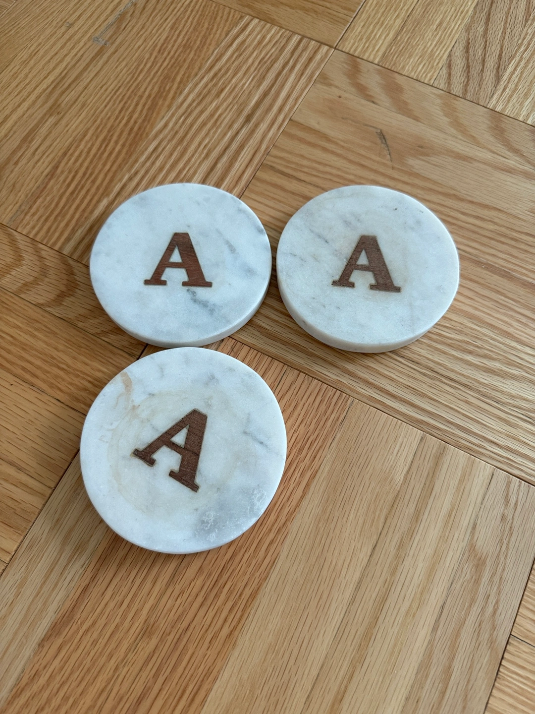 Set of 3 marble coasters with the letter A engraved in each. The coasters are circular and in good condition.