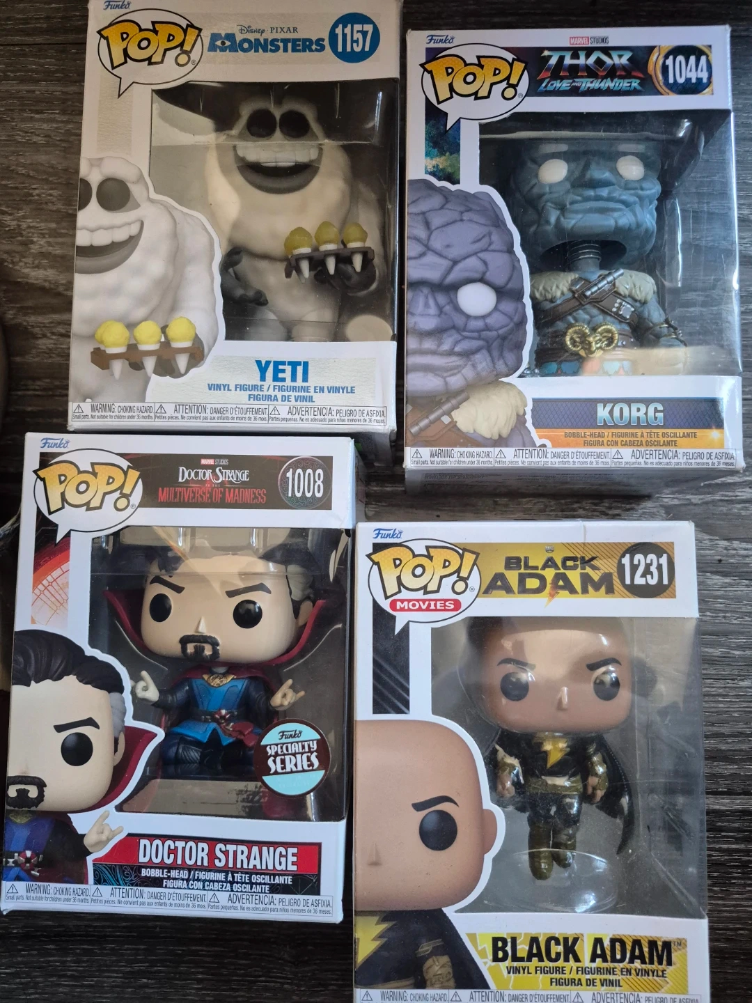 Collection of four Funko Pop! vinyl figures: Yeti from Monsters, Korg from Thor: Love and Thunder, Doctor Strange from Multiverse of Madness, and Black Adam. These are bobble-head figures in their original boxes.