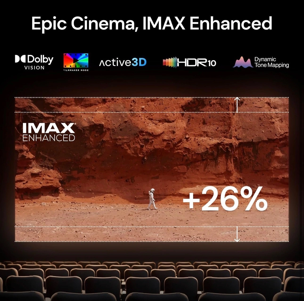 Your Home, A Cinematic Masterpiece - Experience IMAX Enhanced technology that preserves up to 26% more image content in the iconic 1.9:1 or 1.43:1 aspect ratio. With an adjustable screen size from 50" to 300", customize your theater to your space. Paired with Dolby TrueHD Atmos and DTS-HD Master Audio, it delivers immersive, lossless sound for a truly cinematic experience.