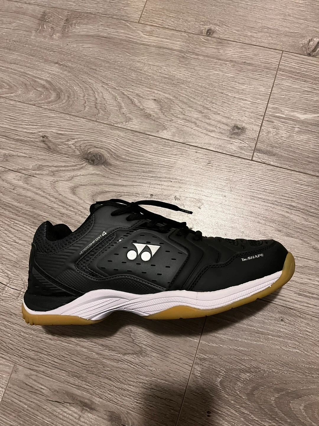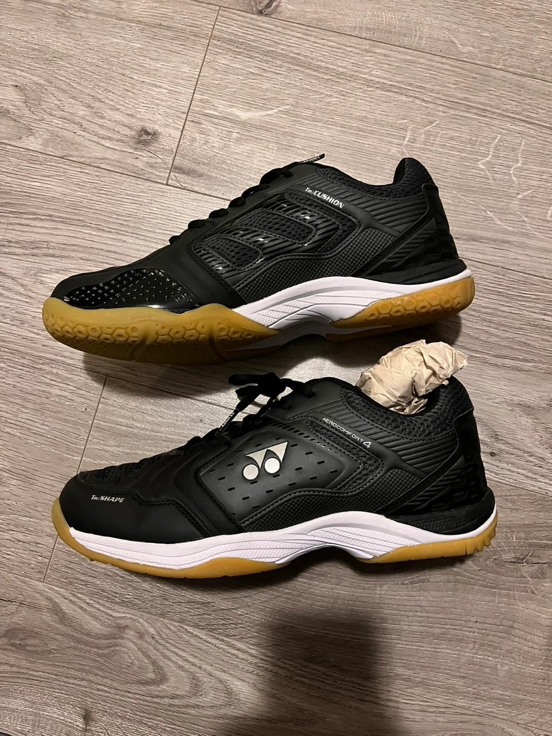 These are Yonex men indoor court shoes. They're black and size 10. The shoes feature a rubber sole for grip. They're great for badminton or other indoor court sports!
