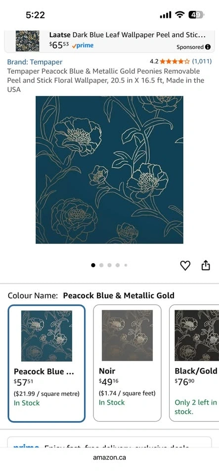 Blue & Gold Metallic Peacock Peel and Stick Wallpaper Roll