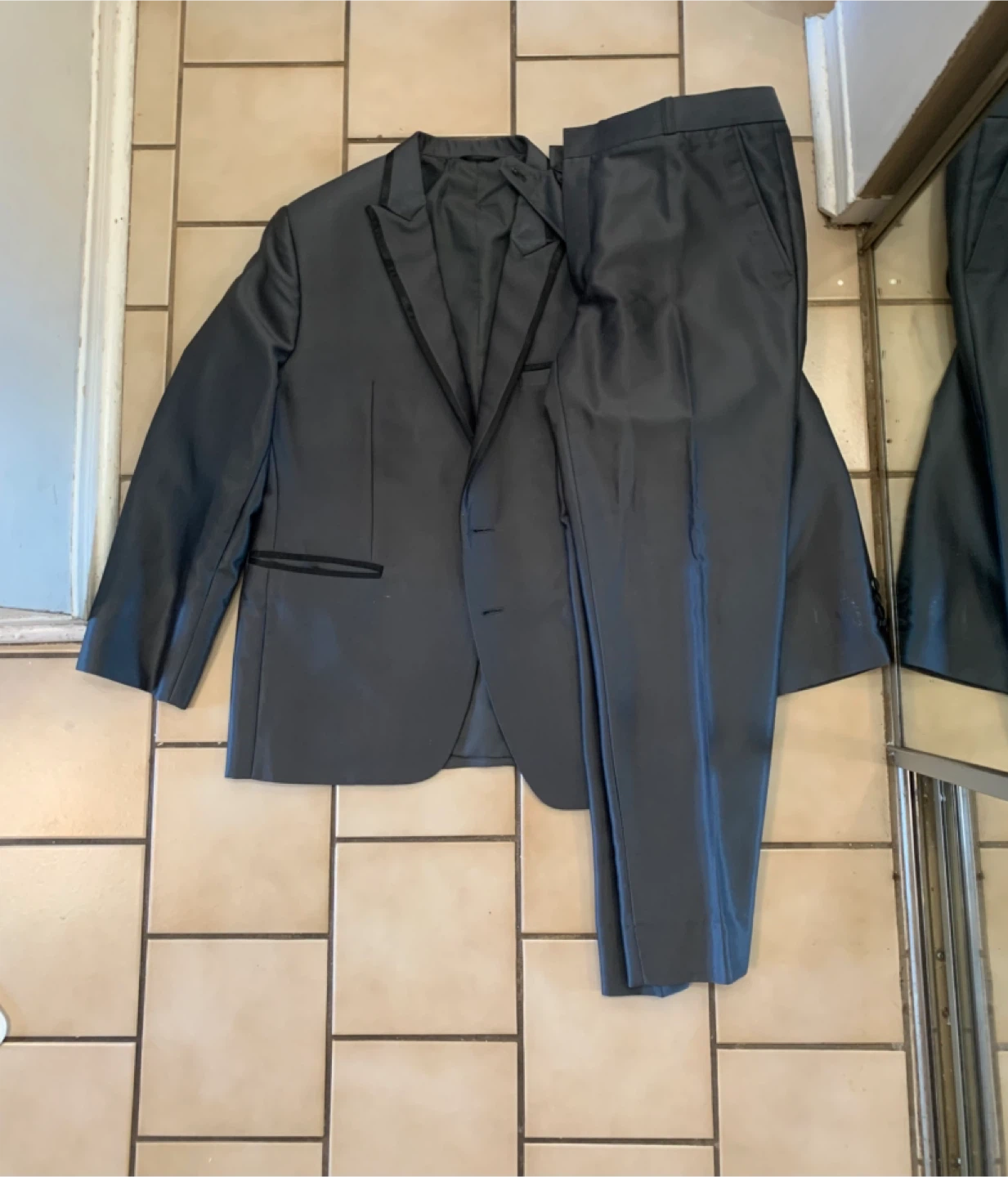 Two-piece men's suit in a dark grey colour. It features black satin lapels and trim. Includes a matching jacket and trousers. Comes with a garment bag.