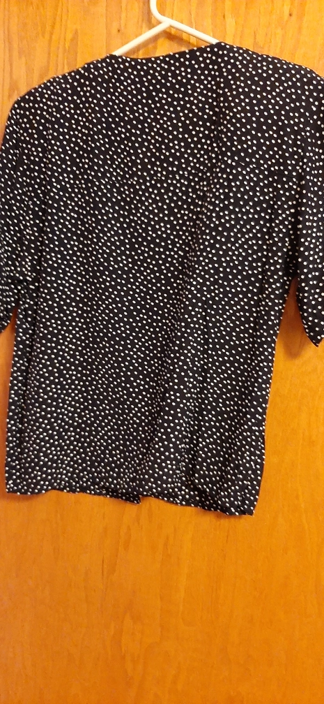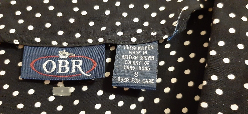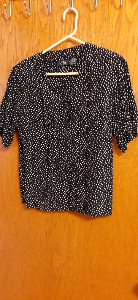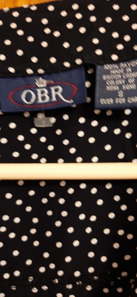 Vintage Cute OBR blouse with a classic polka dot pattern! It's made of 100% rayon and is a size small. Perfect for adding a touch of retro style to your wardrobe.