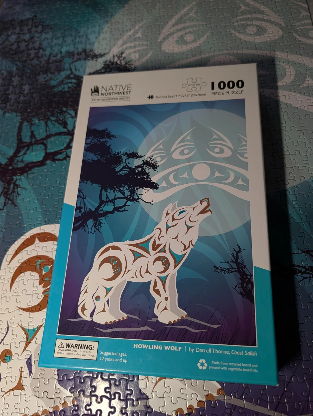 This Native Northwest jigsaw puzzle features a "Howling Wolf" design by Darrell Thorne, Coast Salish artist. It's made from recycled board and printed with vegetable-based ink. Suggested for ages 12 years and up.
