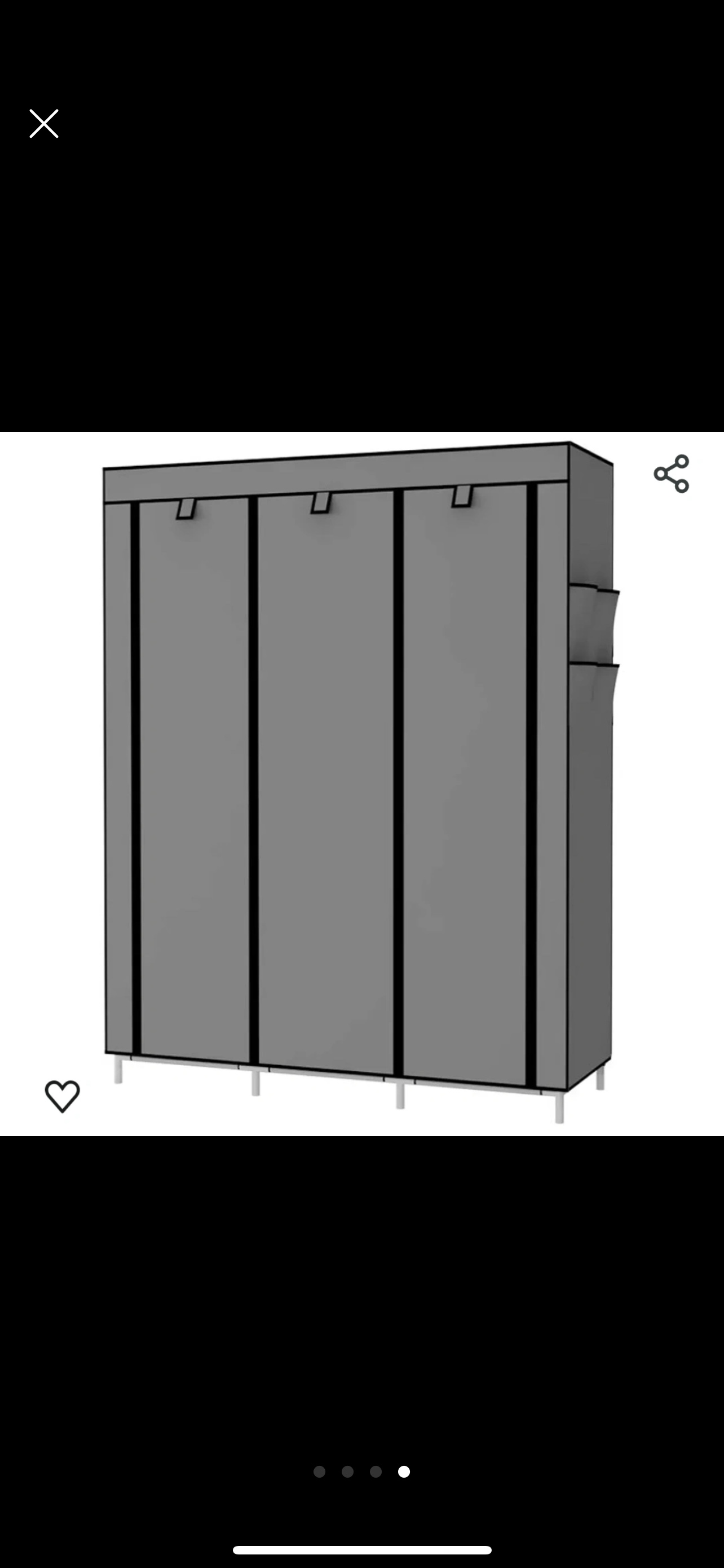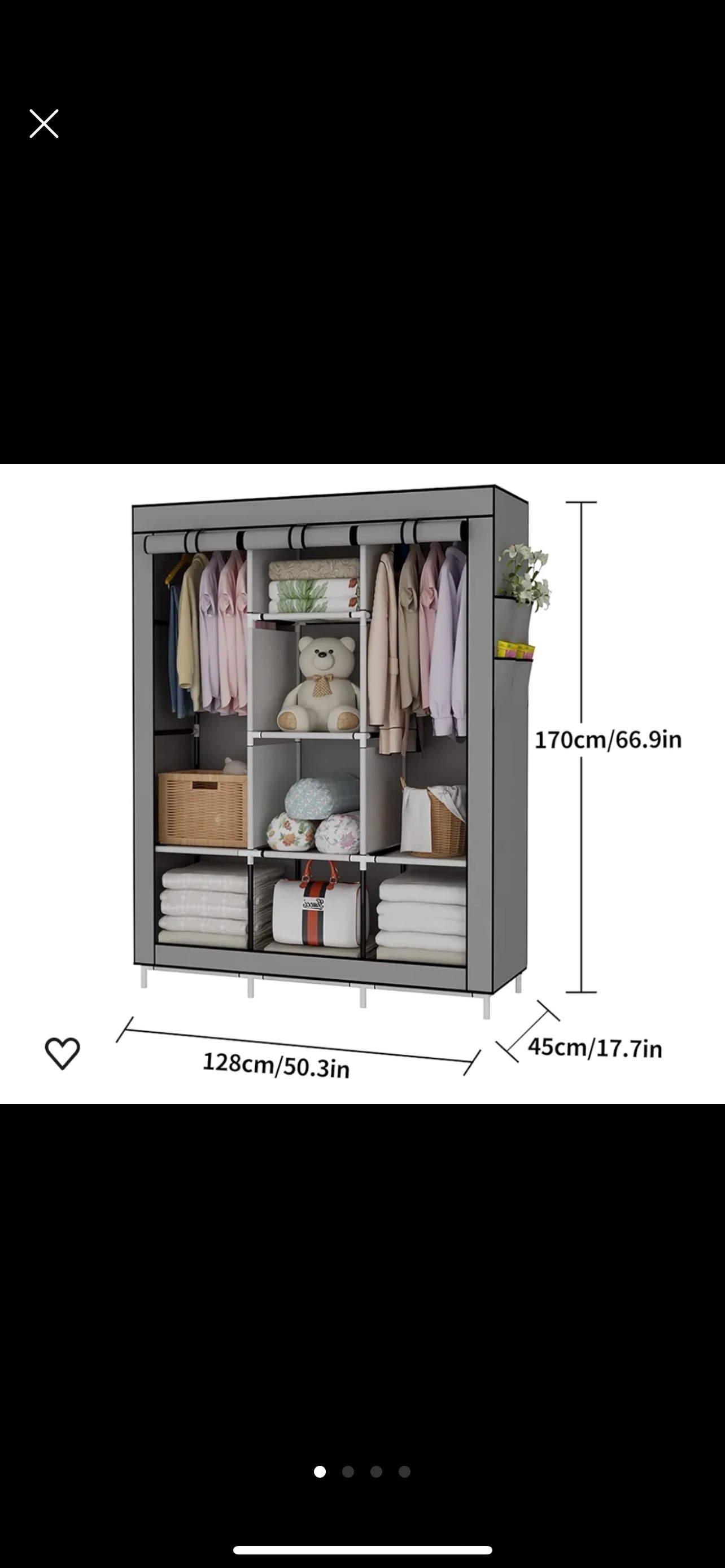 This is a portable closet with 6 storage shelves, 2 hanging sections, and 4 side pockets. It is grey in colour and measures 170cm x 128cm x 45cm. It is great for organizing your clothes, shoes, and other items.