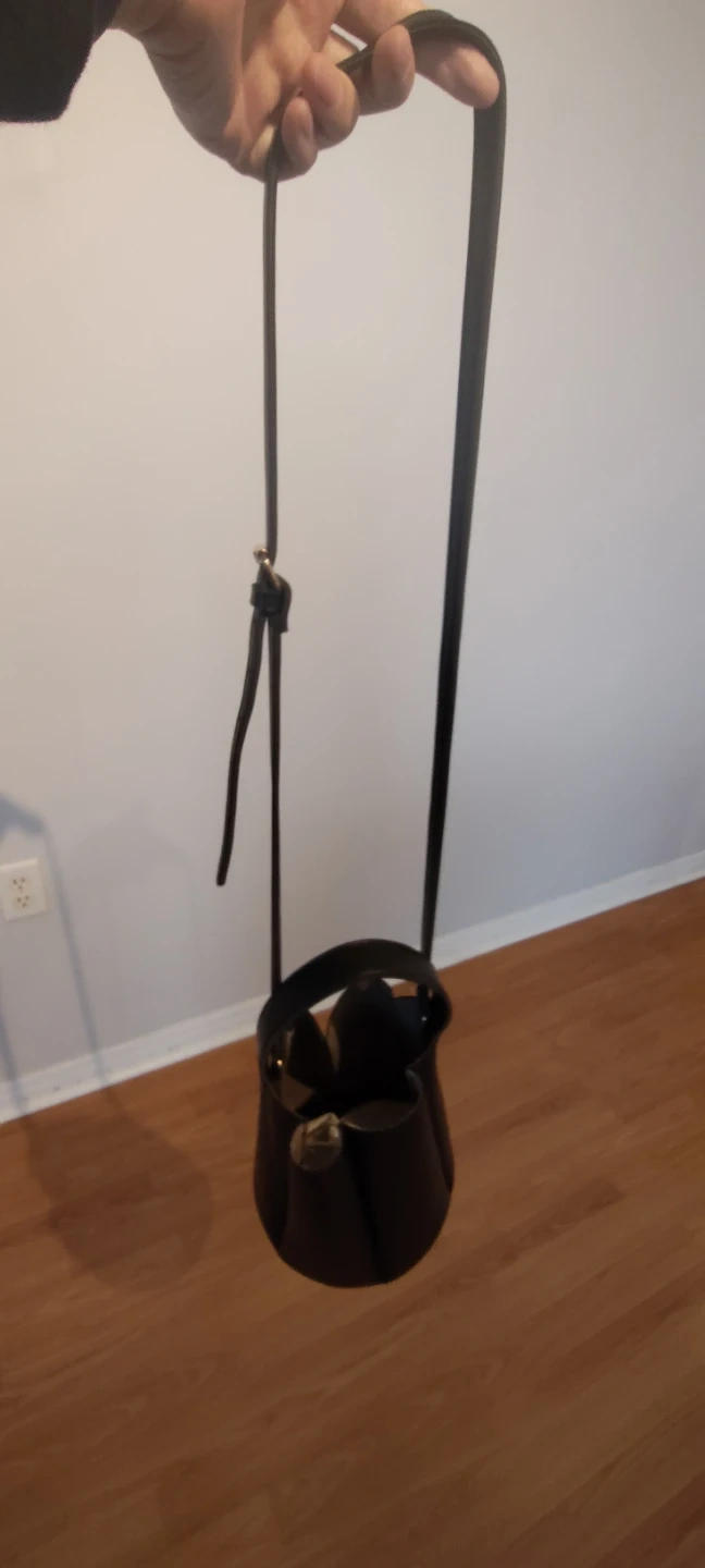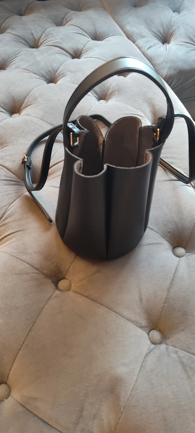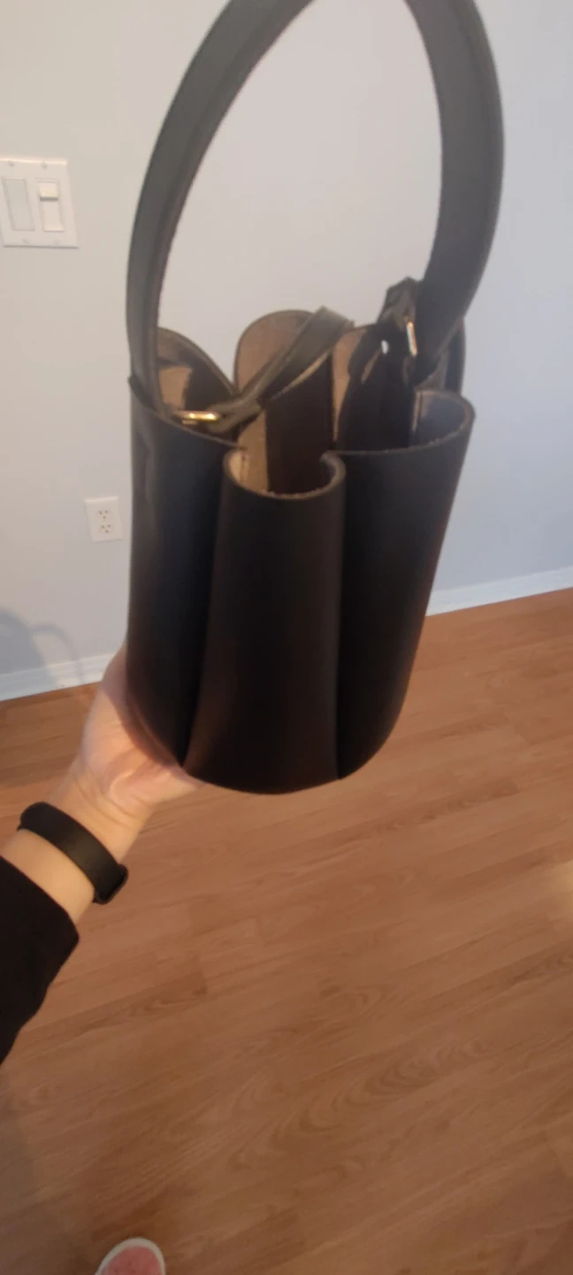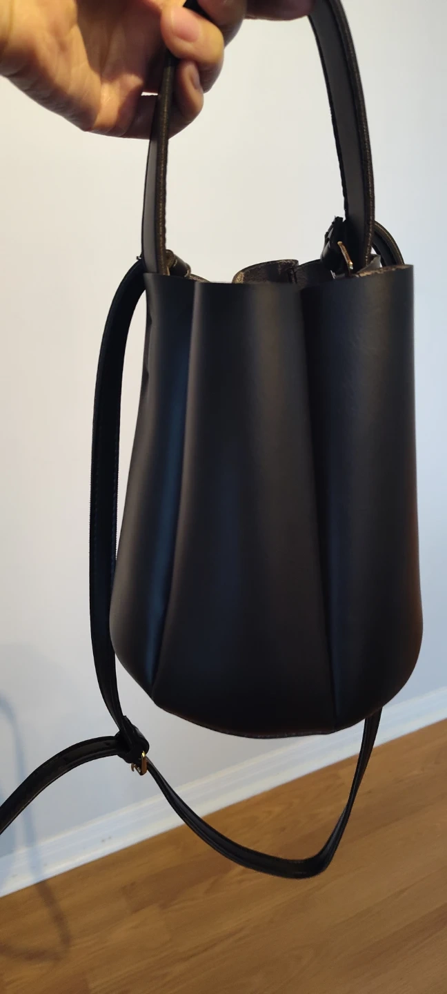 This is a stylish black faux leather bucket bag. It's a versatile accessory with a top handle and a shoulder strap. The interior is designed with compartments.