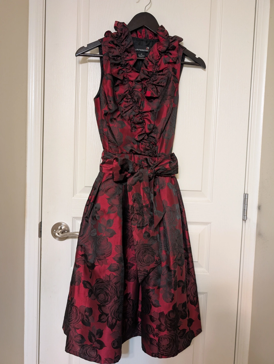 Beautiful sleeveless dress. Features a ruffled neckline and a fitted bodice. A-line skirt with black roses on a red background. Includes a matching fabric belt.